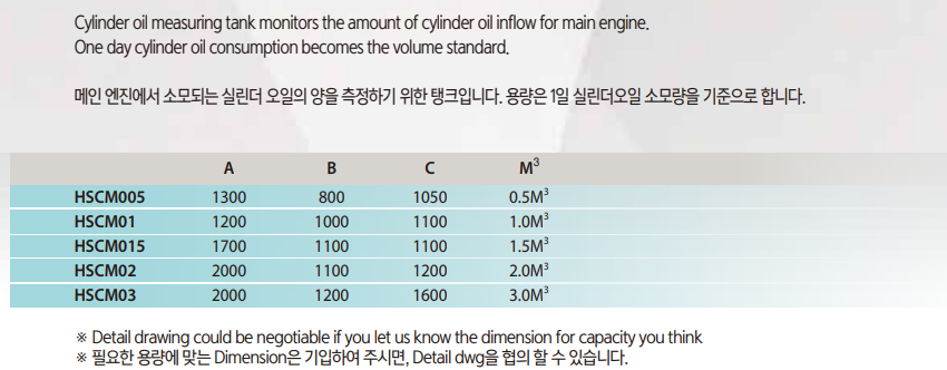 The Cylinder Oil Measuring Tank monitors the amount of cylinder oil inflow for the main engine.