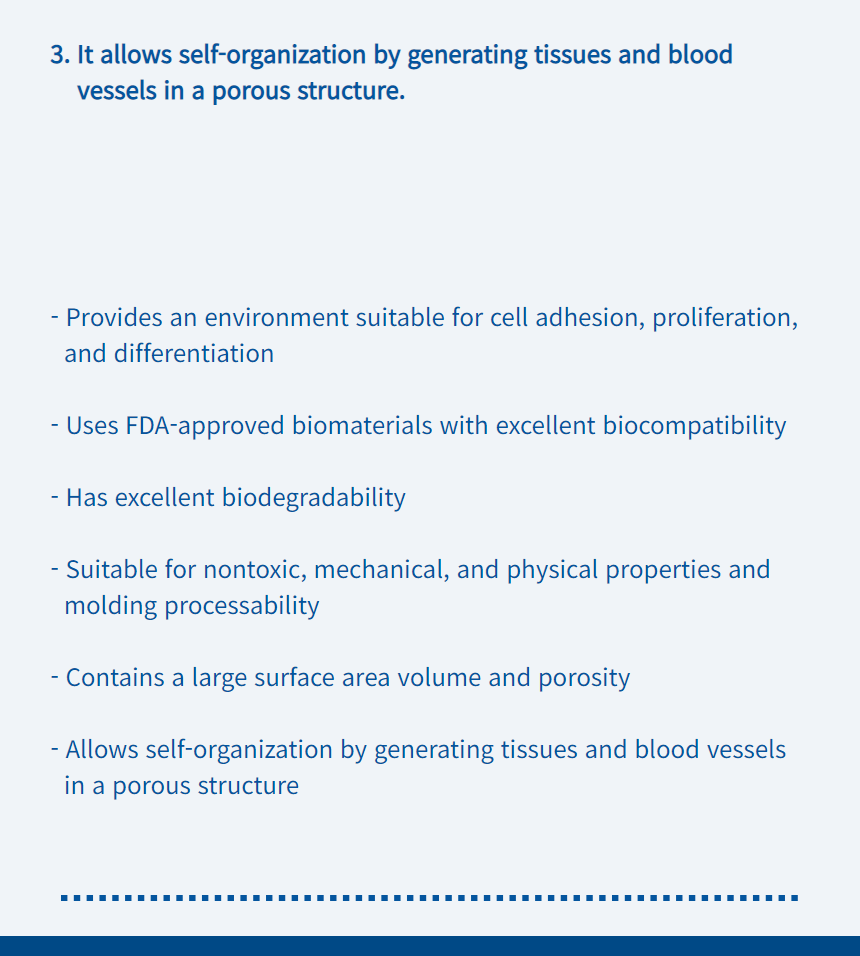 2. It has such a highly porous structure that it can efficiently convey nutrients, oxygen and growth factors, or remove by-products from biodegradation.