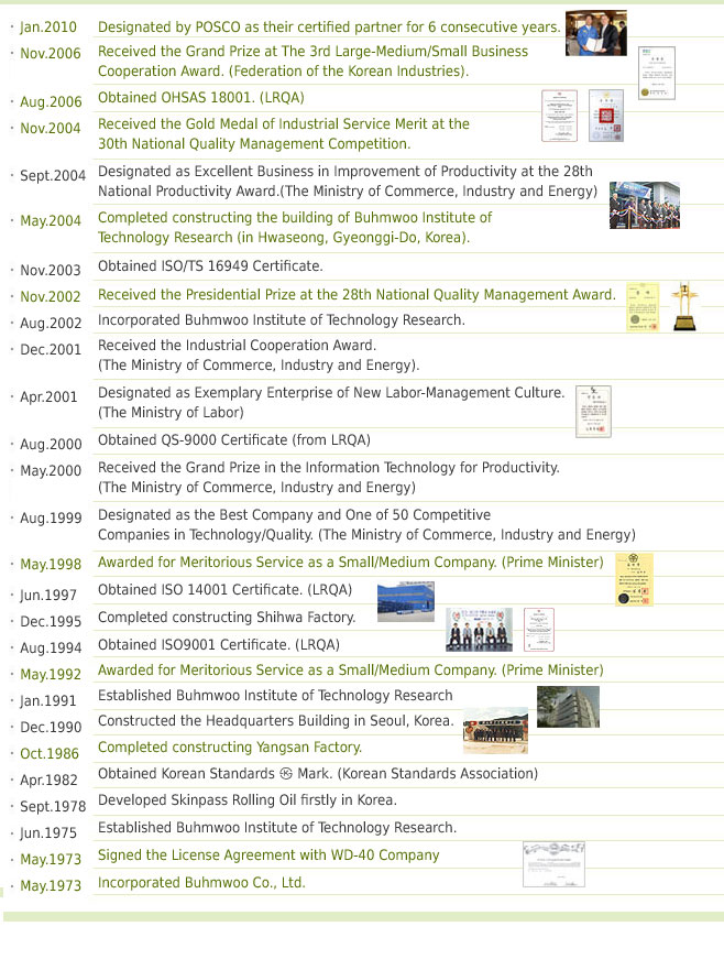 Superior quality of Buhmwoo's cold rolling oil is known well, which is proved by being awarded as the Next Generation World-class Product of Korea at the Korean World-class Product Award 2012.