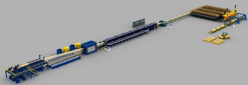 The line is optimized to produce sandwich panels with the best productivity and central control. It is composed of 3 different sections of uncoiling & profiling, laminating & cutting, stacking & packing. The uncoiling & profiling section is to release and profile 2 layers of steel. The laminating & cutting section is to inject polyurethane onto the steel, making it into foam by heating while it is passing through the double slat conveyor, and lastly cut into the required length. At the stacking & packing section, the finished panels are piled up by an auto stacker. Then the panel bundle is packed with a vinyl wrap for safe delivery to the customer.