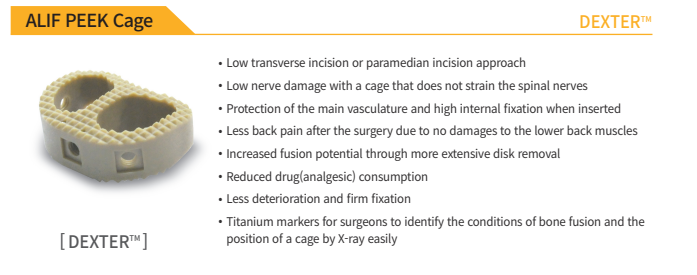 DEXTER™ ALIF PEEK Cage is a lumbar fusion device used for an ALIF (Anterior Lumbar Interbody Fusion) approach (low transverse incision or paramedian incision approach). It is designed to support protection of the main vasculature and high internal fixation when inserted, and to reduce nerve damage with a cage structure that does not strain the spinal nerves. It aims to increase fusion potential through more extensive disk removal, reduce drug (analgesic) consumption, and provide less deterioration and firm fixation. Titanium markers allow surgeons to easily identify bone fusion conditions and the position of a cage by X-ray.