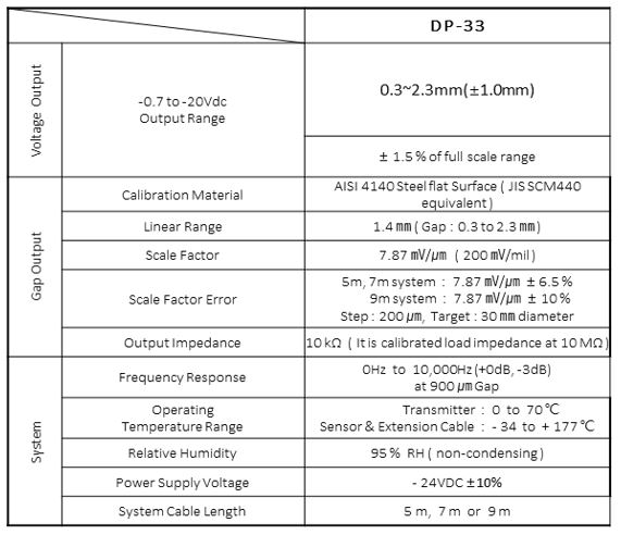 - Small size and durable noncontact displacement transducer using a driver powered by a -24VD, which is easy to apply in the instrumentation site.