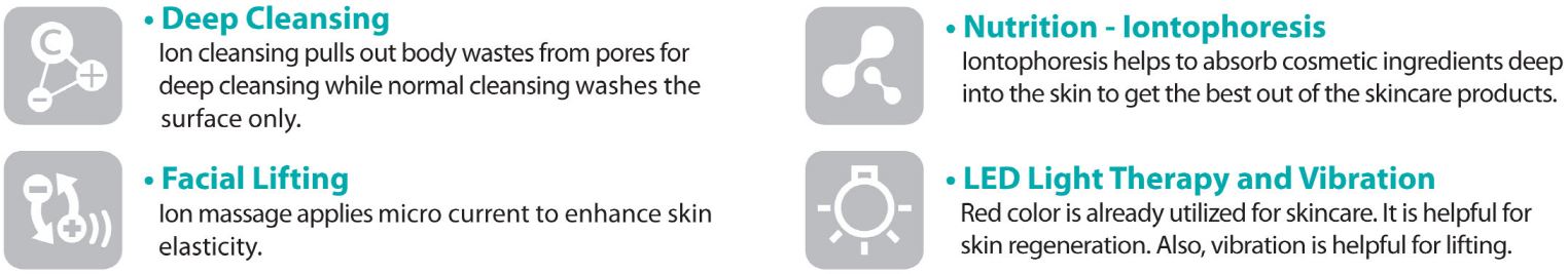 The cosmetic nutrients cannot be absorbed deep into the skin. The Pobling Galvanic Iontophoresis ionizes the nutrients and penetrates deeply into the skin.