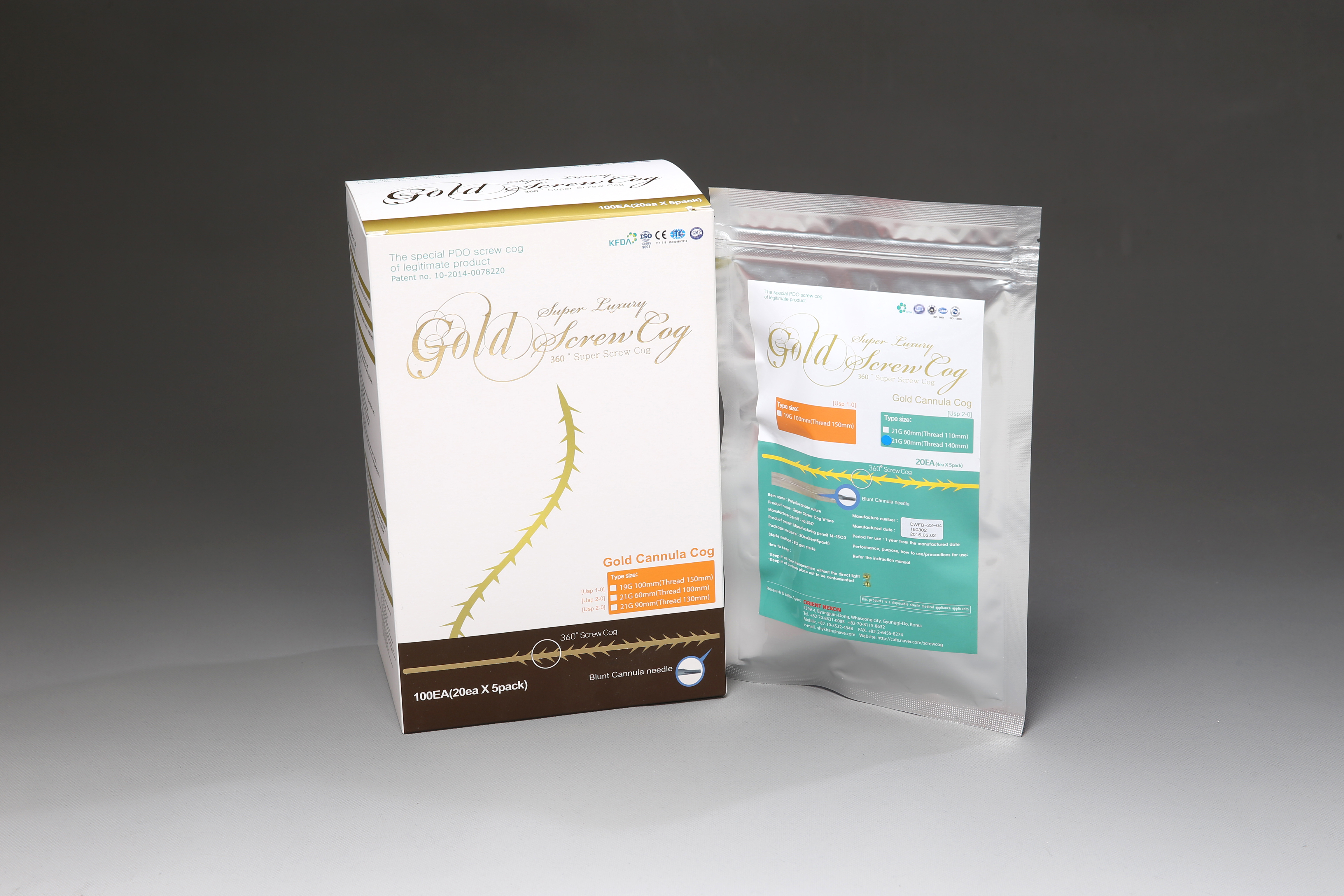 Trinity PDO Gold Lifting is operation concept that can obtain lifting, whitening and tightening three effects at once. In this concept, PDO Gold Cannula Cog is the world`s first Gold-Coated Cog PDO thread. Through this concept, we can get surgical effect and aesthetic effect at once with only one product.