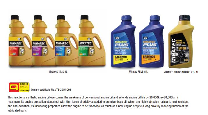 MIRATEC is a wonderfully innovated synthetic engine oil. This extended-life lubricant oil is designed for longer cycles of oil change compared to other conventional products. Based on deeply understanding the surface activity chemistry, it is formulated from basic-products (Lubrizol of the USA and Gatway of Germany) and top-quality synthetic bases (USA and UK) are added by our own blending technologies. It will keep your engine always virgin.