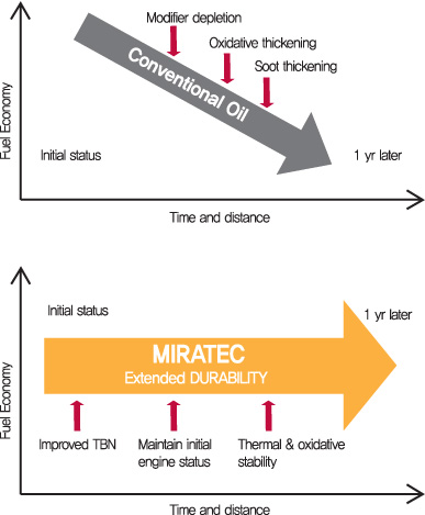 Improved stability against acidic by-products from blow-by gases. Superior anti-wear effect will protect your vehicle engine from aging and fatigue. MIRATEC makes your engine always powerful.
