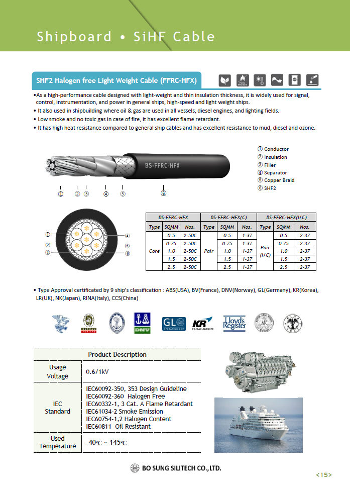 BS-FFRC-HFX can be installed in all electrical fields in the ship for power, control, and instrumentation purposes, including all ships, high-speed ships, and ferries, and can be applied to engine, lighting, fuel, and oil-resistant sensor parts in the ship.