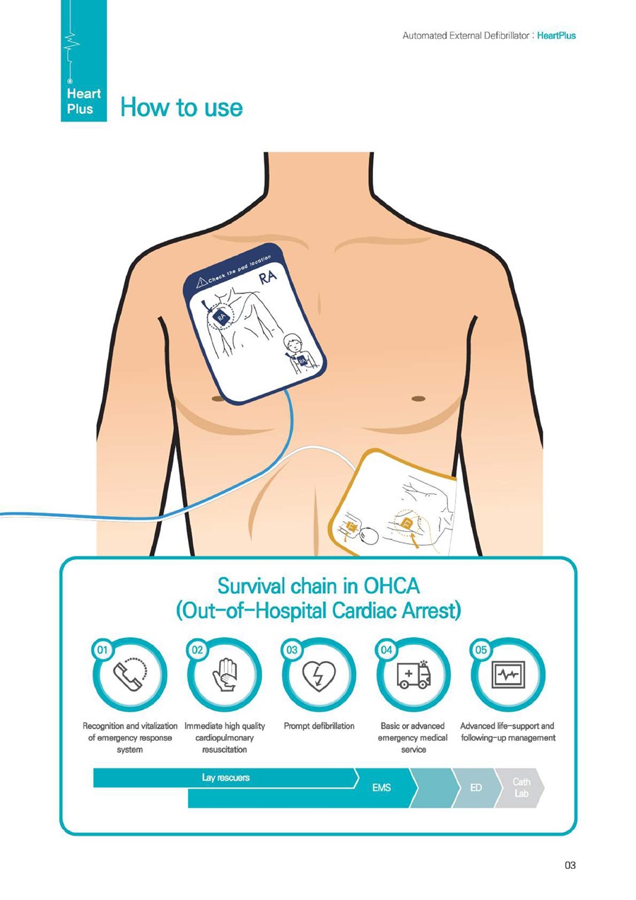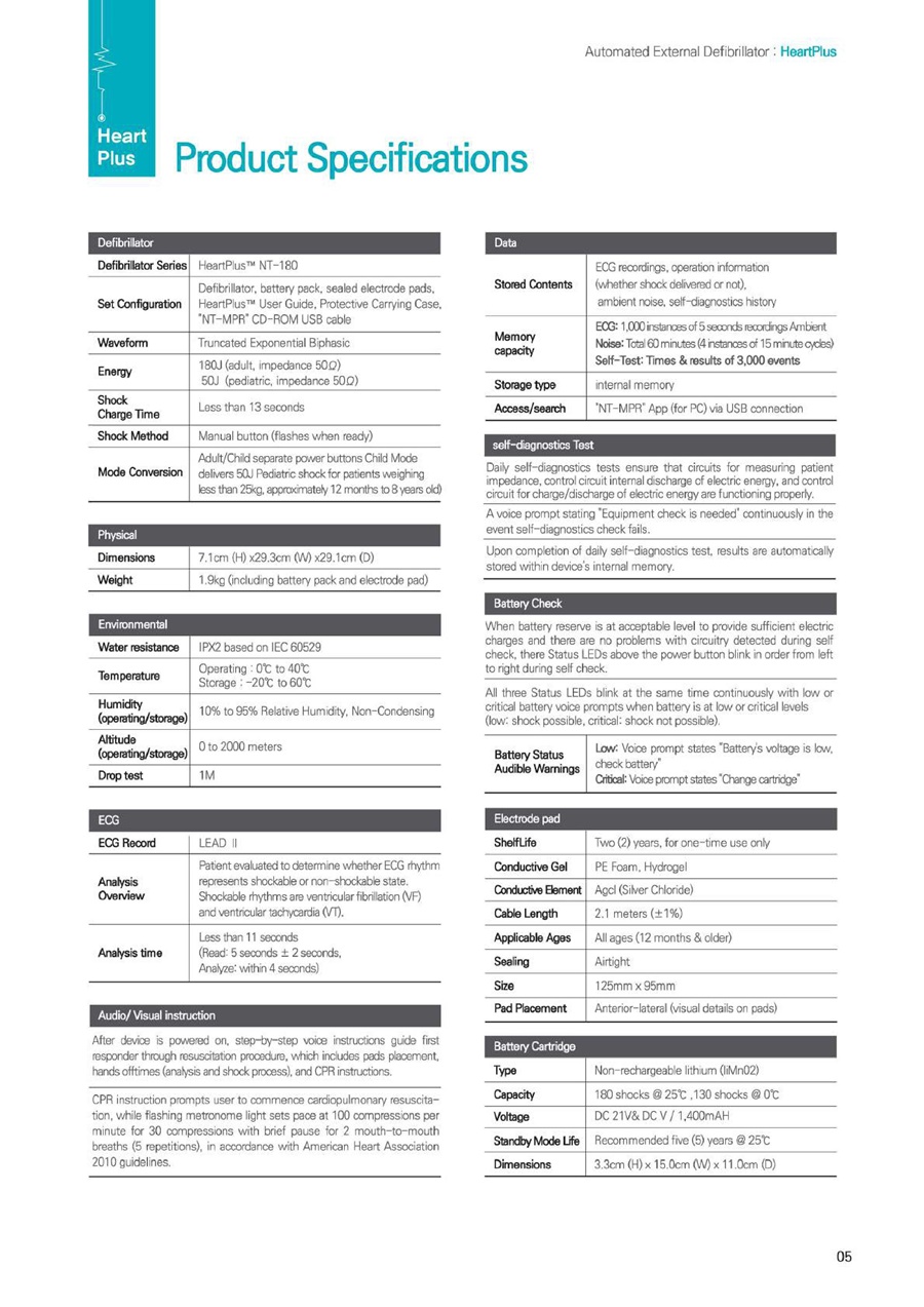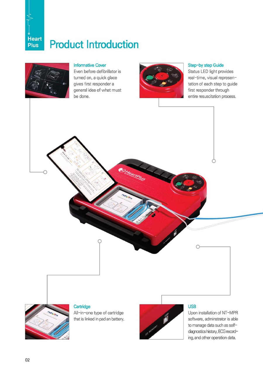 HeartPlus NT-180 is a compact, portable device that analyzes the heart’s rhythm and delivers a defibrillation shock to re-establish the normal heart rhythm. HeartPlus NT -180 guides the user through each step of the defibrillation process by providing voice/ visual prompts. HeartPlus NT -180 of Nanoomtech Co., Ltd provides electrode pads that can be used for both adults and children. The all-in-one cartridge features pads that are pre-connected to a battery in one sealed package, with just one expiration date to remember.