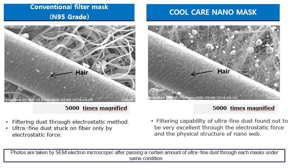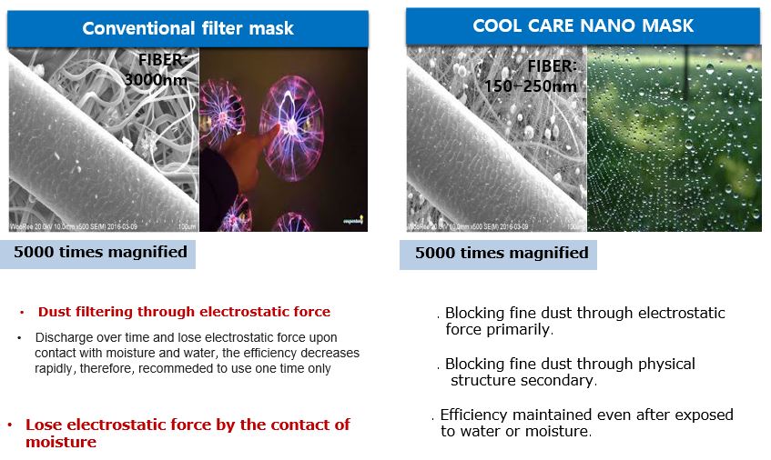 COOL CARE NANO MASK is made by spraying Nano-fiber additionally to the conventional electrostatic trapping filter Melt Blow.