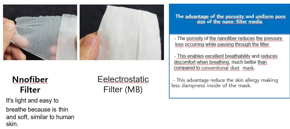 nanoweb filter reinforcing the efficiency of the static deterioration due to moisture produced when wearing the mask,
