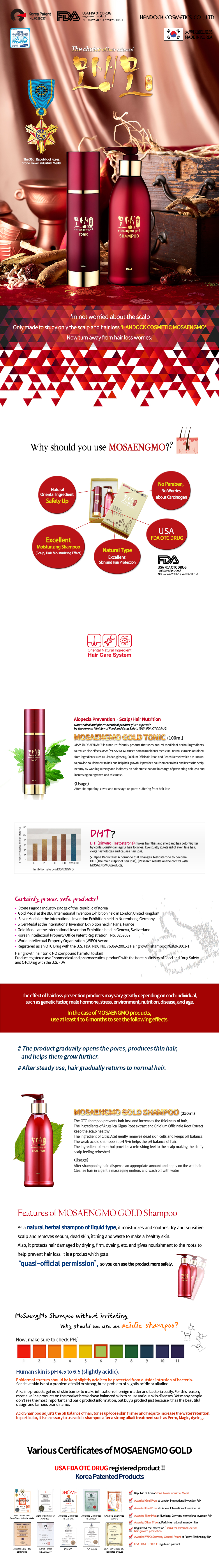 MOSAENGMO means “producing hair” in Korean. This product is a product of Doctor MOSAENGMO which is named as such by reflecting the function of overcoming hair loss. “The value of a product is equivalent to the effects of the product. The product’s phenomenal record of 99% customer satisfaction is not achieved overnight.” Doctor MOSAENGMO, which has accumulated research achievements and know-how over the past few decades, has received Pagoda Industrial Award and various prizes from around the world. It has also achieved 99% customer satisfaction. The company is jump-starting itself to become a global company. (Based on the company’s investigation in 2012)