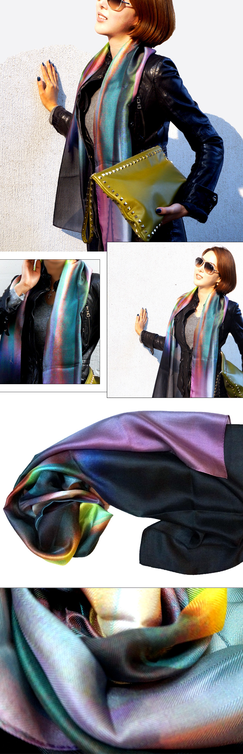 Elegant scarf made with 44% wool and 56% silk, providing abundant volume and good wearing sensation.