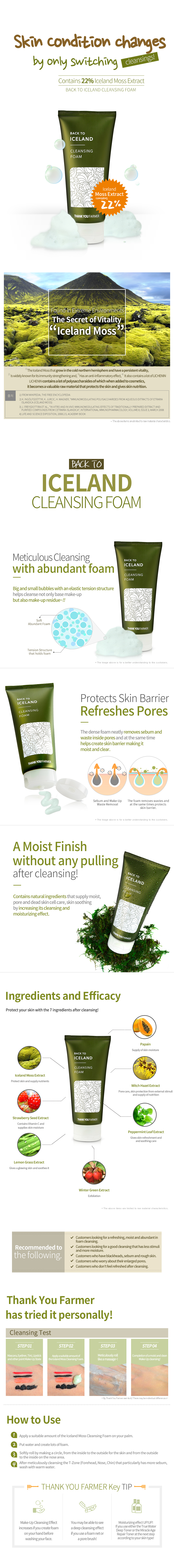 Cleansing foam clearly cleansing skin residue with Iceland Moss extract that is growing with strong lige force under the harsh environment.