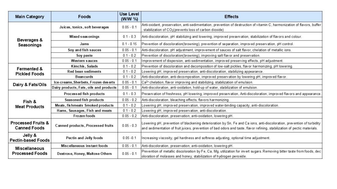 - Functions: Acidity regulation, decoloring, antioxidation, antimicrobial activity, metal ion chelation, anti-browning, shelf-life extension