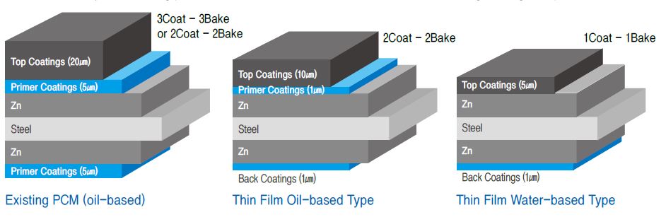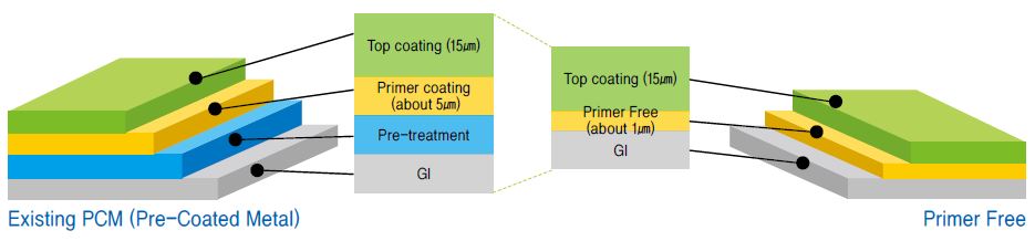 | This primer-free coating agent is used to give the anti-corrosion function and better look to hot dip galvanized sheet sheets, Galvalume steel sheets, aluminum-coated steel sheets, electrolytic galvanized steel sheet, etc. Steel sheets are coated with primer-free agent and top coating only because pre-treatment and primer coating layers are integrated. Differently from the 3-layer coating of pre-treatment, primer coating and top coating, this process enables to function even on thin films which intergrated primer free coating layer with reduction of electric power consumption and colored steel sheet production cost. | |
