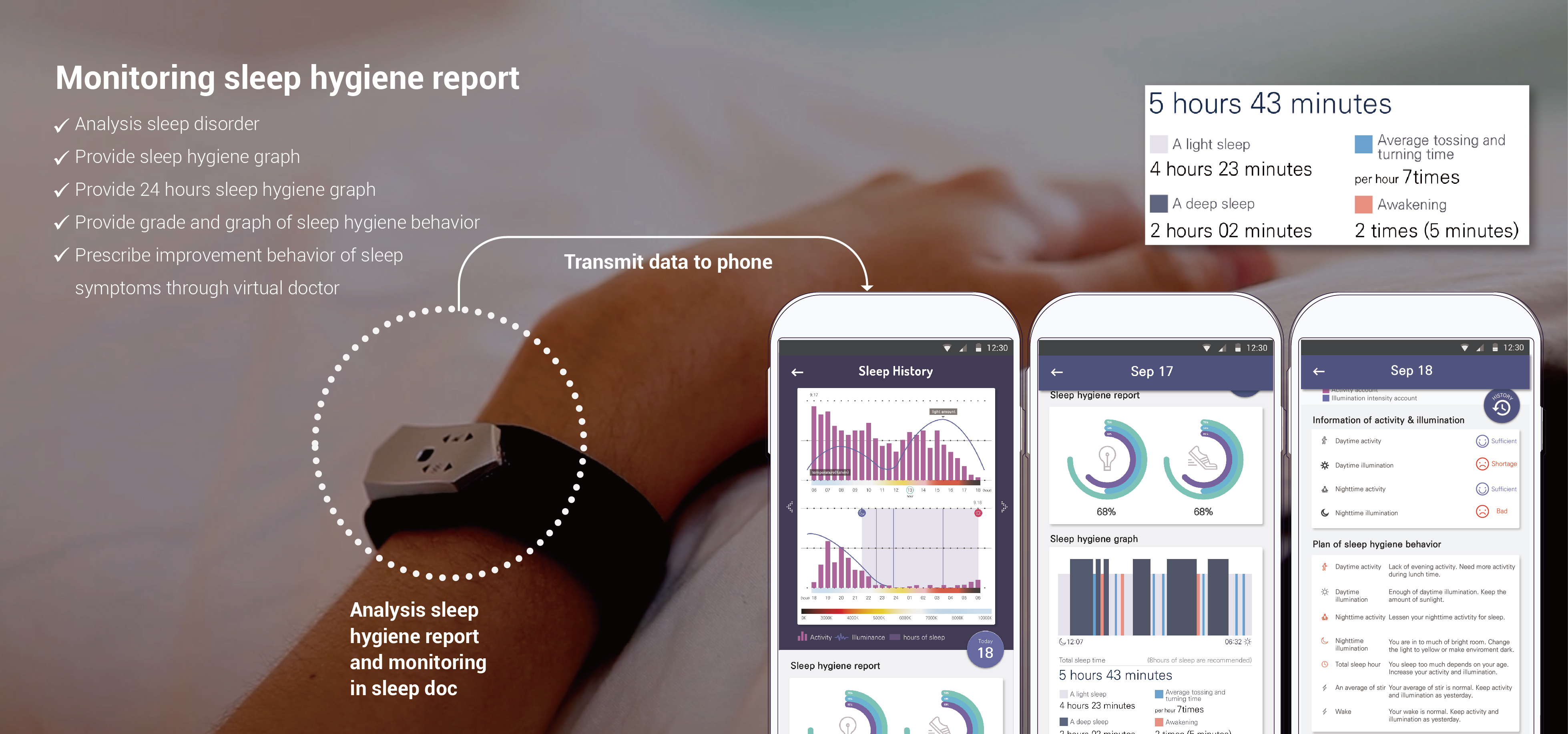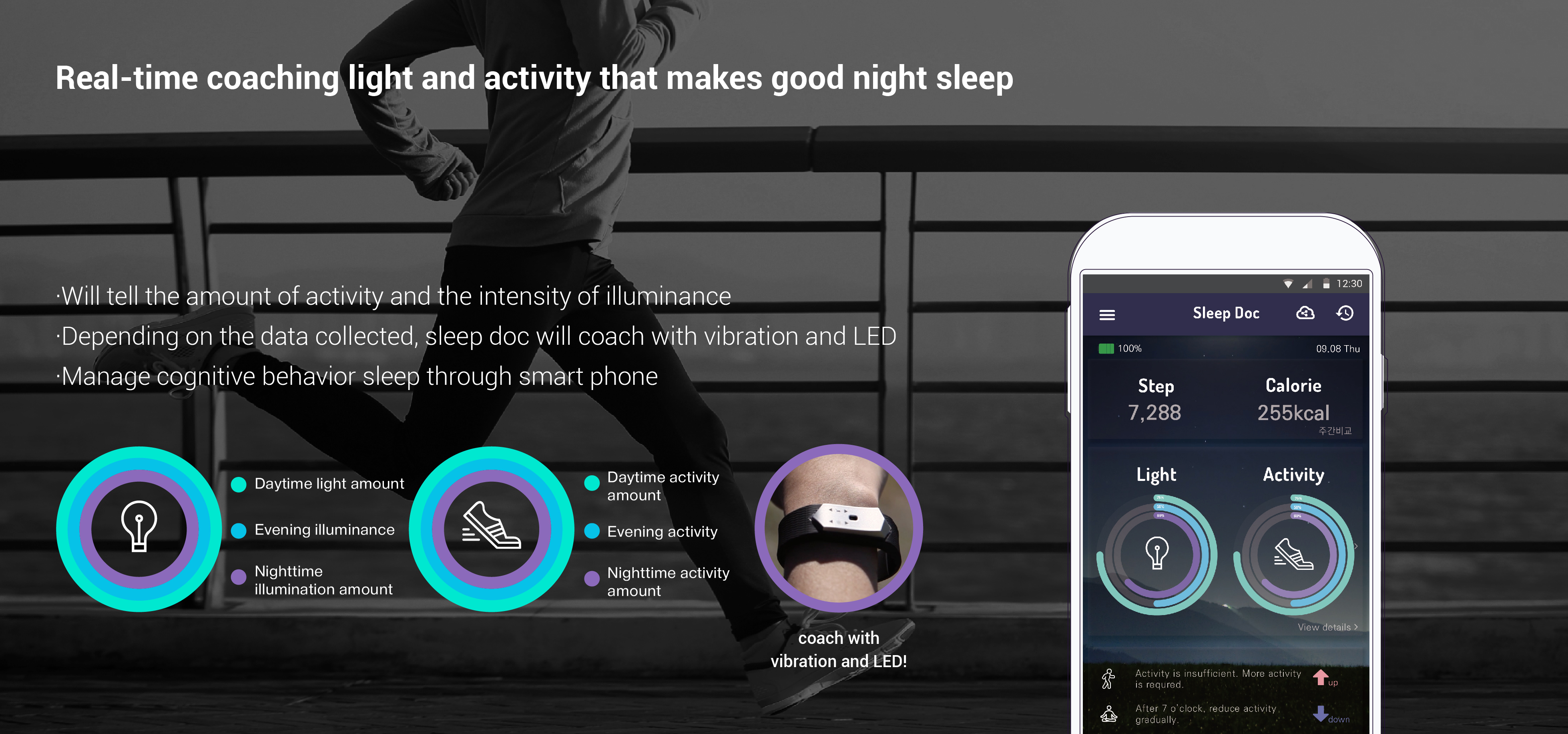 By analyzing a behavioral pattern of the day and night sleep, the Sleep Doc service gives planning and coaching of sleep hygiene activities for a good night’s sleep. Thus Sleep Doc is an approach of a new paradigm, a wearable band for improvement from sleep disorder Sleep Doc induces sound sleep by improving a physiological symptom which is a root cause of sleep disorder. By making analysis of the amount of a day and night’s light, light’s temperature, and sleep tracking information, the product can coach a user, so that it can provide the sleep cognitive behavioral plan and improve the sleep hygiene activities in order to induce good sleep.