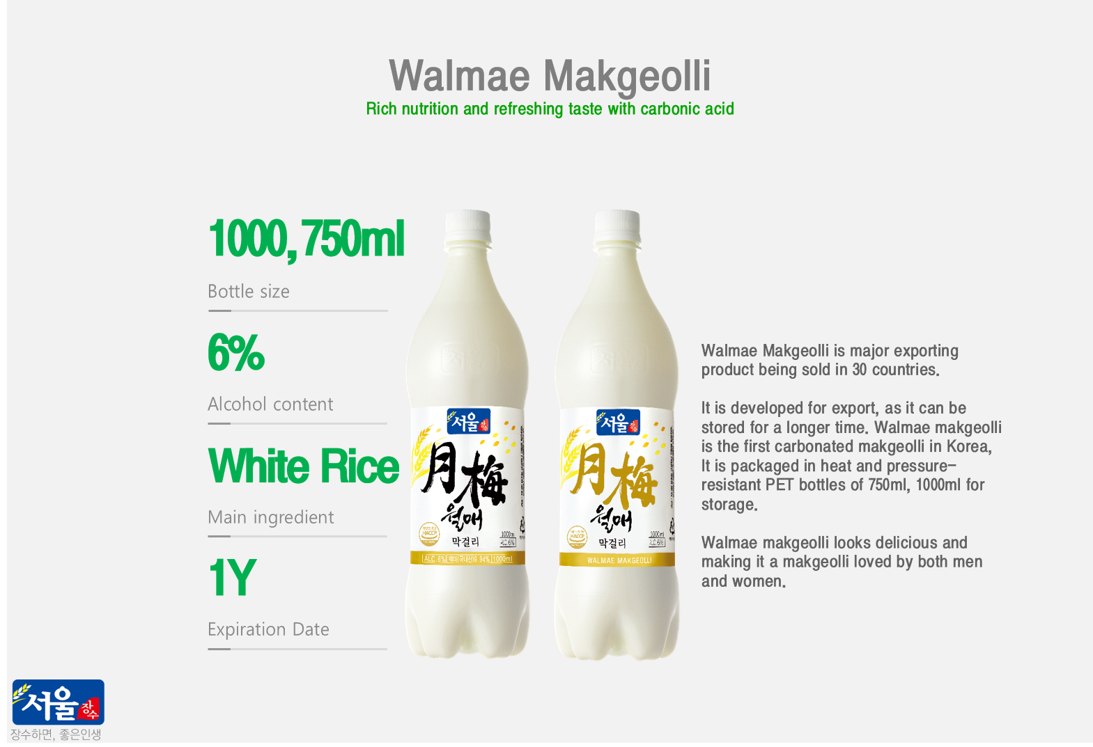It is developed for export, as it can be stored for a longer time. Walmae makgeolli is the first carbonated makgeolli in Korea, It is packaged in heat and pressure-resistant PET bottles of 750ml, 1000ml for storage.