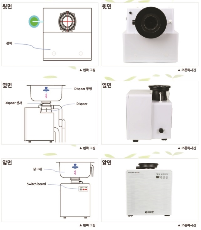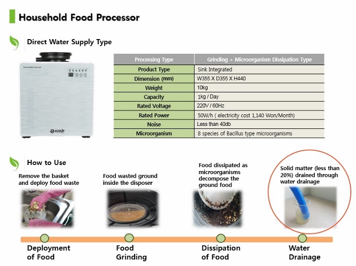 Our product combining a disposer and microorganism pursues environment-friendly food waste disposal. As its characteristics, after food waste is ground in the sink through the disposer, if it is decomposed as the size good for degrading microorganism, it goes through the natural decomposition process in the microorganism agritating box and emitted as CO2 and H2O.