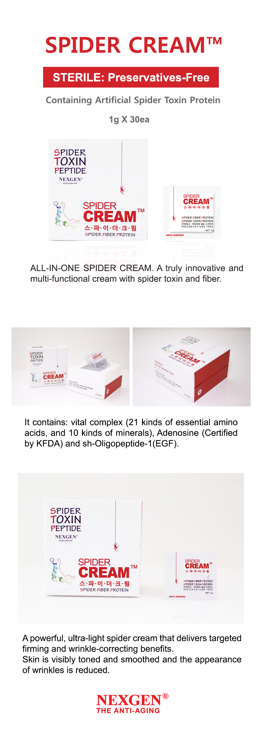 SPIDER CREAM ™ is an anti-wrinkle cream containing r-Spider Toxin Protein and r-Spider Fiber Protein, which are recombined by Nexgen’s genetic engineering and effective