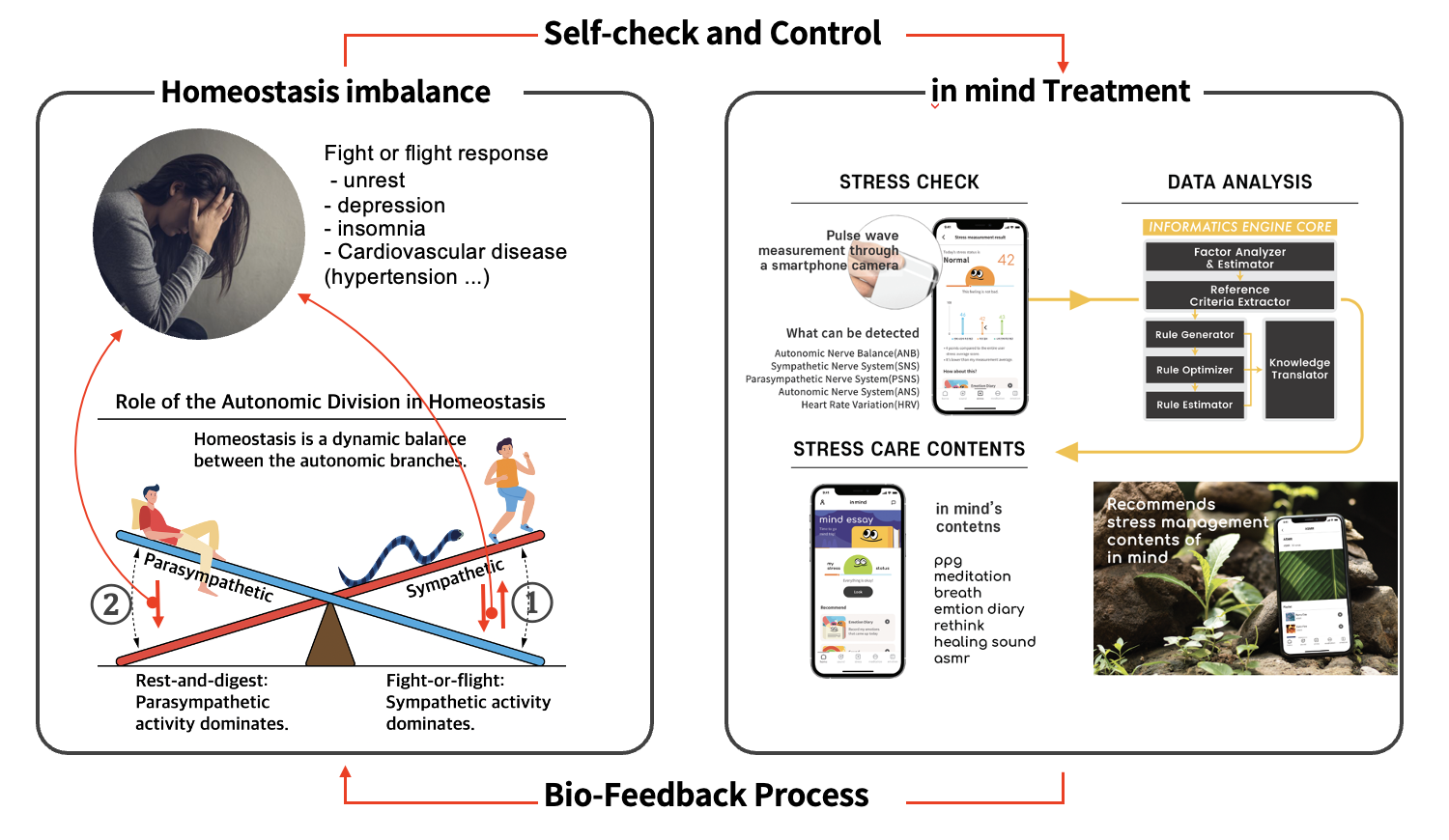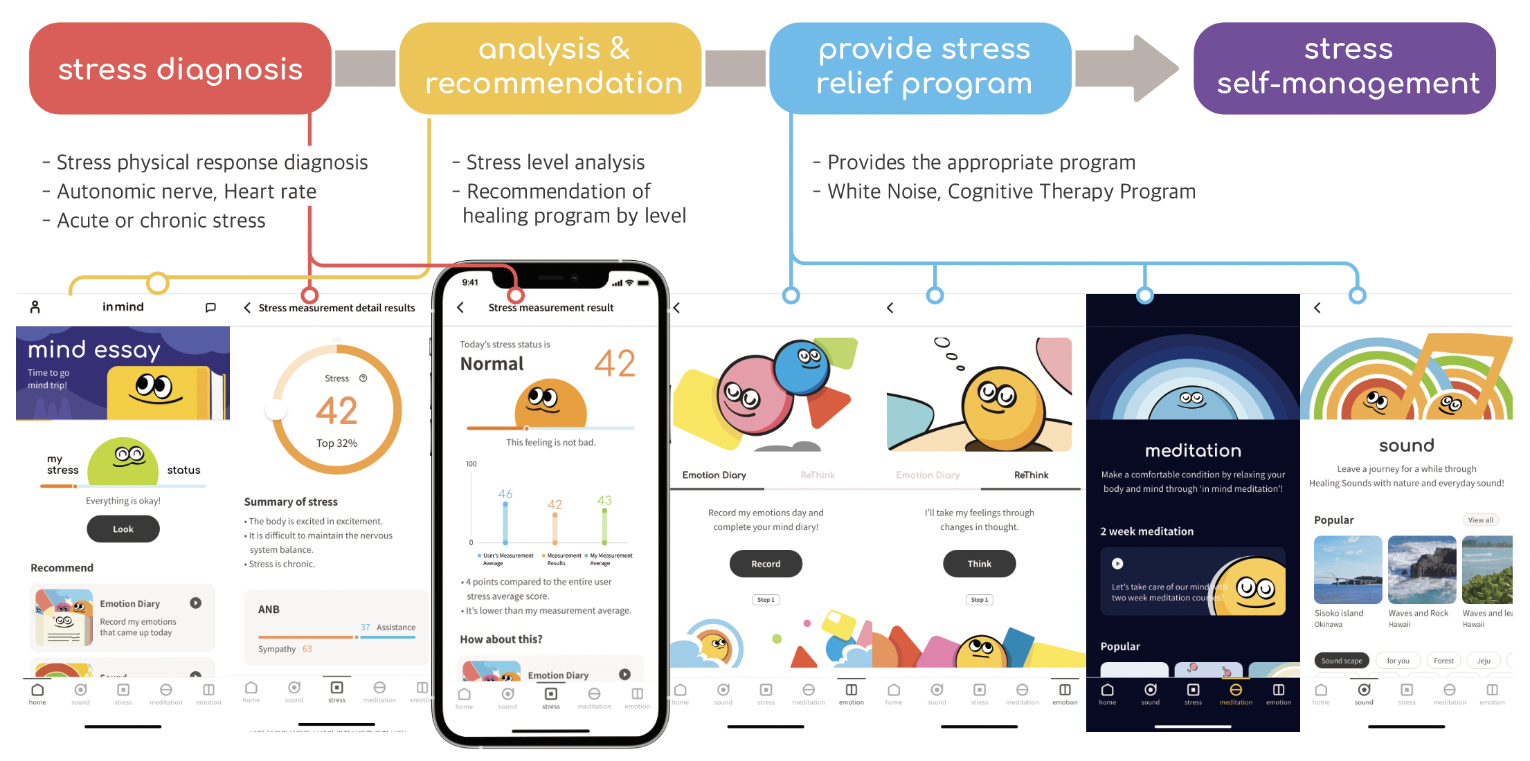 The 'in mind' service is a user-friendly stress management solution that is stressed, AI analysis, recommendation program, healing contents usage.