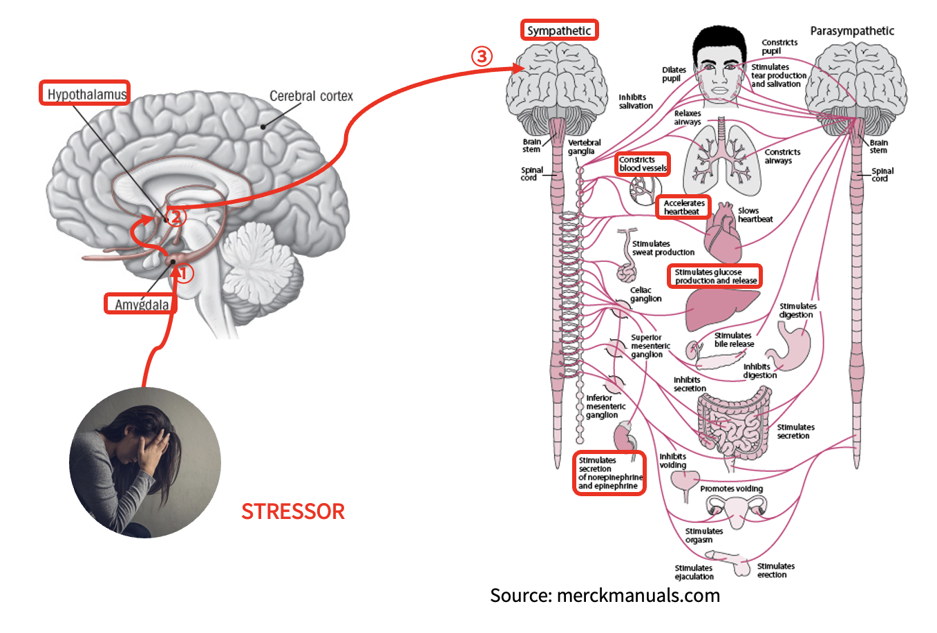 - Hypothalamus: activating sympathetic nervous system through the adrenal glans (epinephrine/adrenaline)