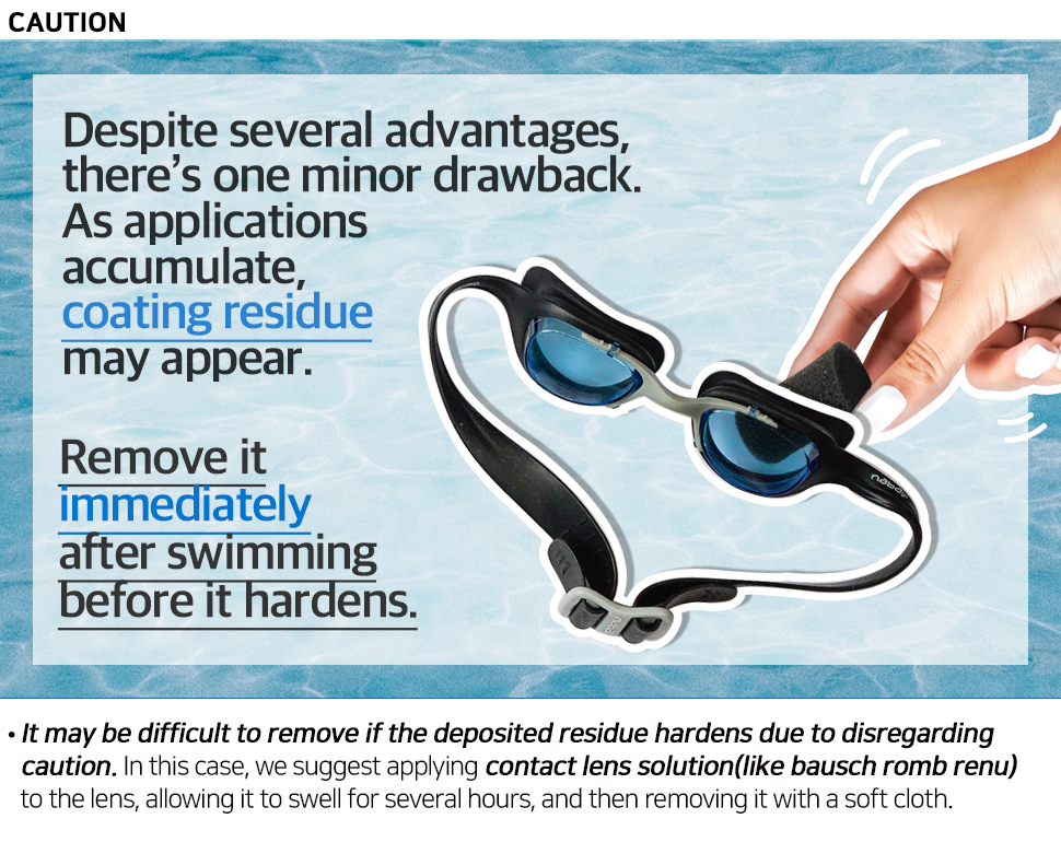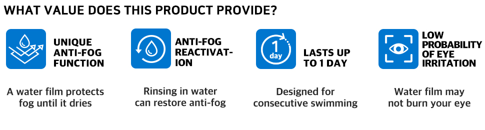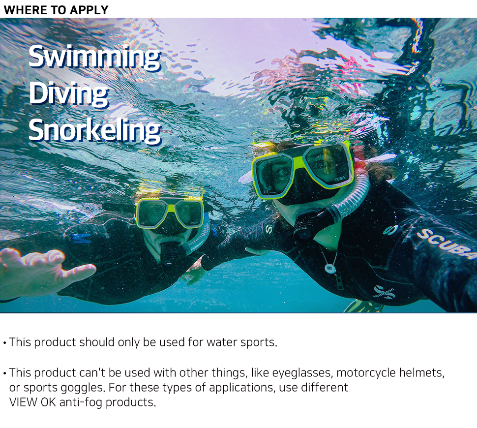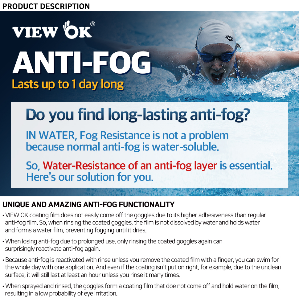Uniqueness: if you soak viewok-applied lens in water, anti-fog function regenerates surprisingly. you can swim within 20 seconds after treatment unlike others