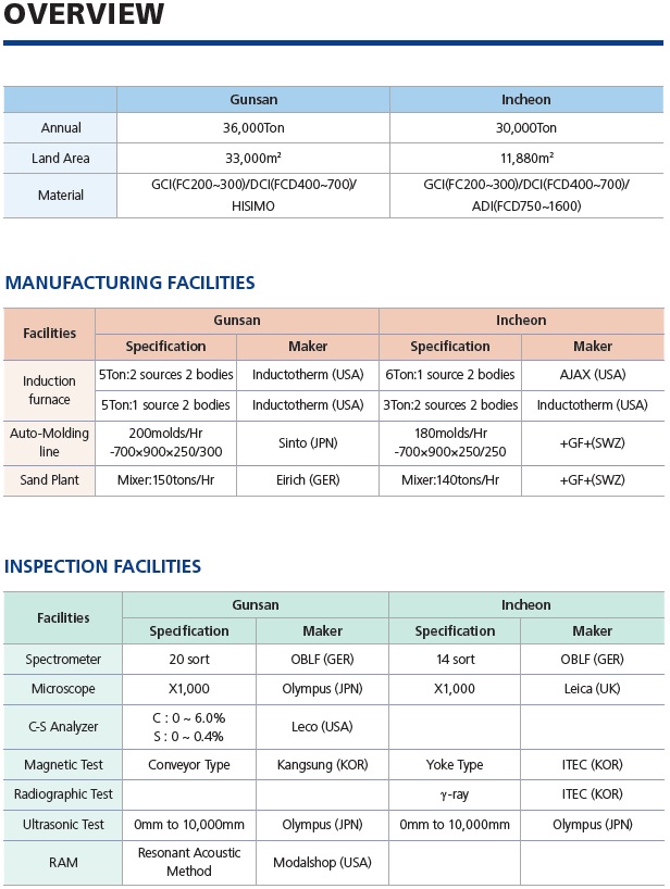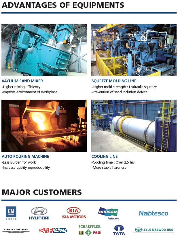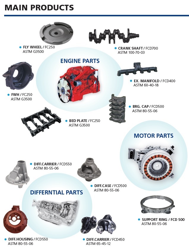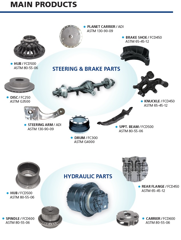 JinHeung Foundry Co., Ltd. is a Korean global leading foundry which produces casting materials for automobiles (passenger cars, pick-up trucks, commercial vehicles), construction equipments and railways. We have been supplying casting materials such as FC, FCD, HiSiMo, and ADI (Austempered Ductile Iron) to many global leading clients.