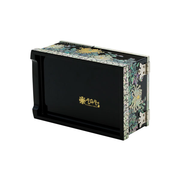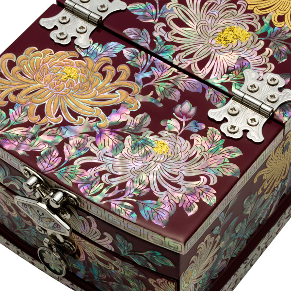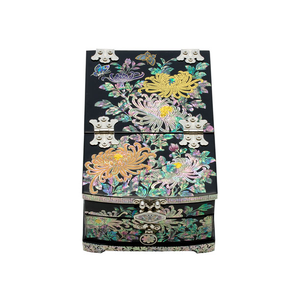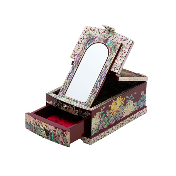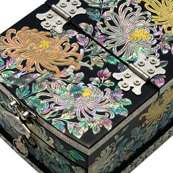 This folded mirror is splendid as golden pearls were added to chrysanthemum If you open the lid and stand the mirror, this mini jewel box can be used as a dressing table. The lid’s bottom face is covered with mother-of-pearl to care about details.