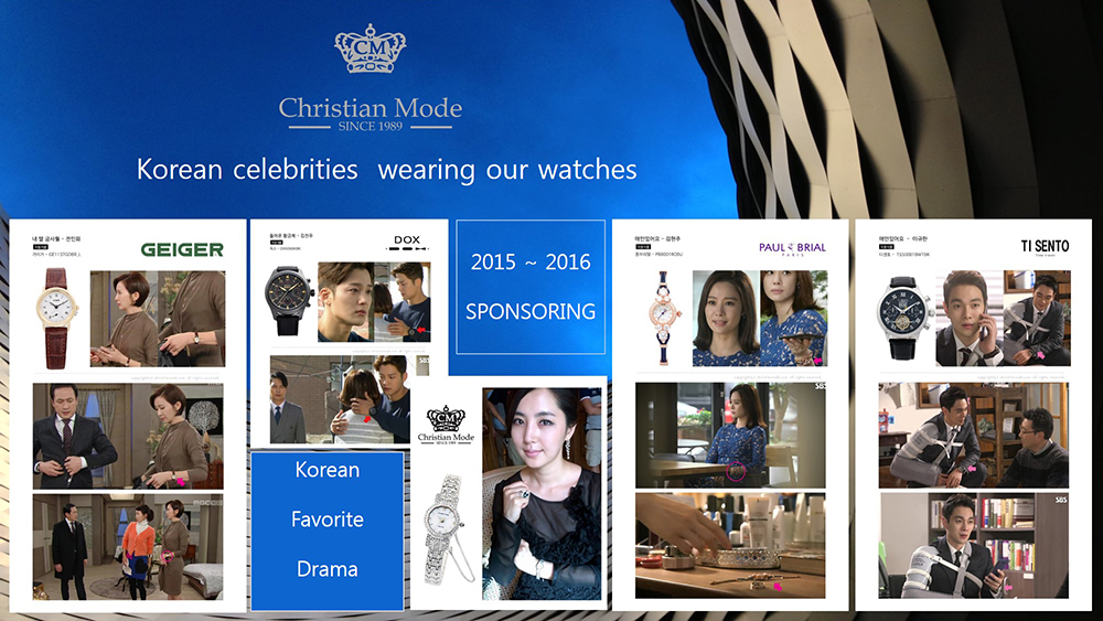 Our company, Christian Mode Co., Ltd., was found in 1989 and has manufactured luxury watch brands in Korea. We are manufacturing Christian Mode, Louis Cardin, D.O.X, GEIGER, Ti Sento, and other brands with the worldwide licenses and selling domestic market as well as overseas under the spirit of Sincerity, Accuracy and Challenge. Also constantly researches new materials and developing design. Our luxury watch brands are manufactured by 30 years of know-how, and our engineers have the best skills for the best quality watches. We have 20 shops including at the department stores in South Korea.
