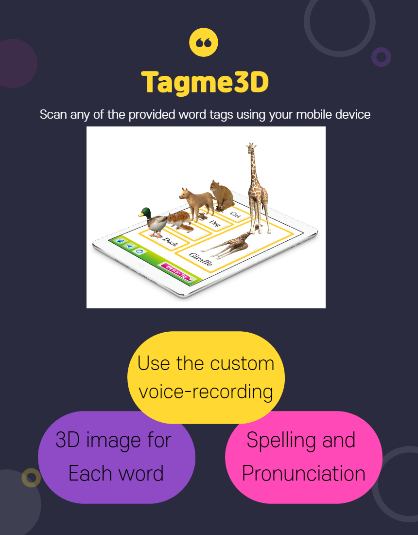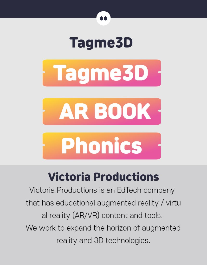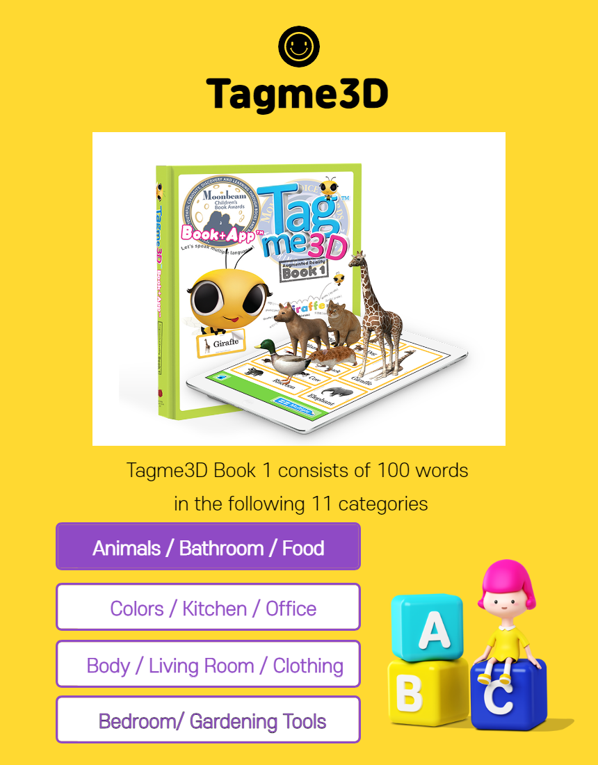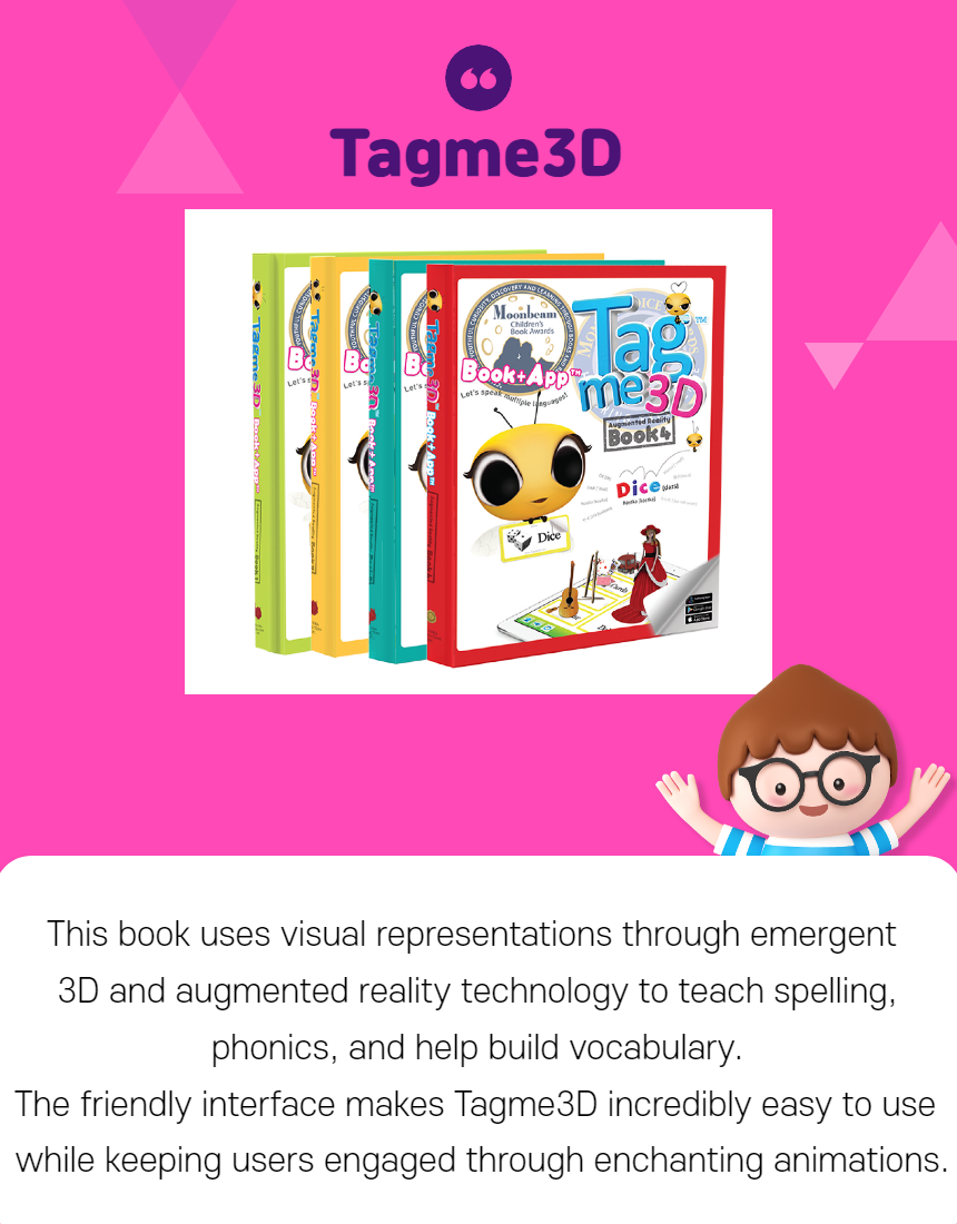"Tagme3D" is an interactive "Book+App" title that makes learning English both simple and exciting. This book uses visual representations through emergent 3D and augmented reality technology to teach spelling, phonics, and help build vocabulary. The friendly interface makes Tagme3D incredibly easy to use while keeping users engaged through enchanting animations.
