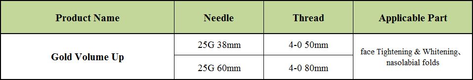 Gold traditionally used in whole world for its medicinal effect. Gold has effect that absorb and eliminate toxin, assist skin`s ion fluency and nutrient absorption. Through these effects, gold threads catalyze collagen regeneration; make skin care effect such as whitening. Traditional gold thread was totally made by gold which was not absorbable, therefore there were lots of effects happened while the non-absorbable gold thread remains in skin. However, gold coated PDO thread will be absorbed after about one year; therefore it can achieve the dramatic cosmetic effect of gold composition and also has no side effects at all.