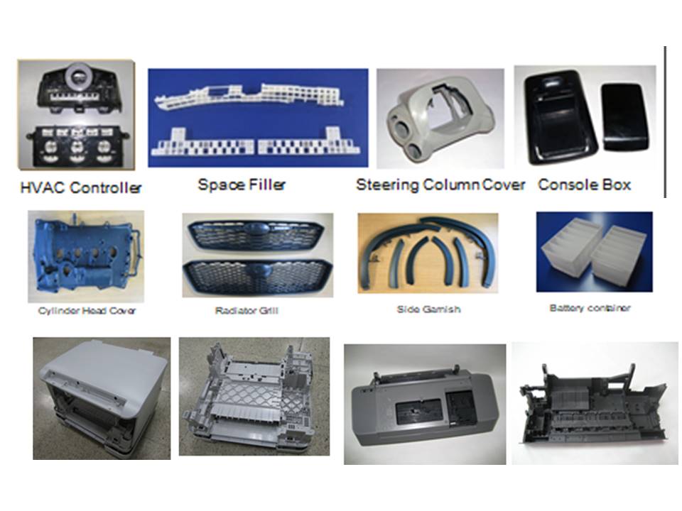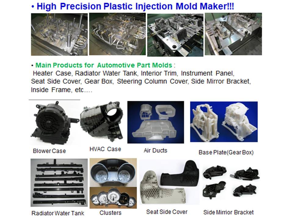 A high precision plastic injection mold and plastic parts for automotive parts. Specialized in designing and manufacturing the plastic injection molds for HVAC case, HVAC controler case, Center facia, Radiator water tank, Radiator grill, Seat side cover, Cluster housing and case, Side mirror bracket, Airbag cover, Battery container, Gear box, etc.