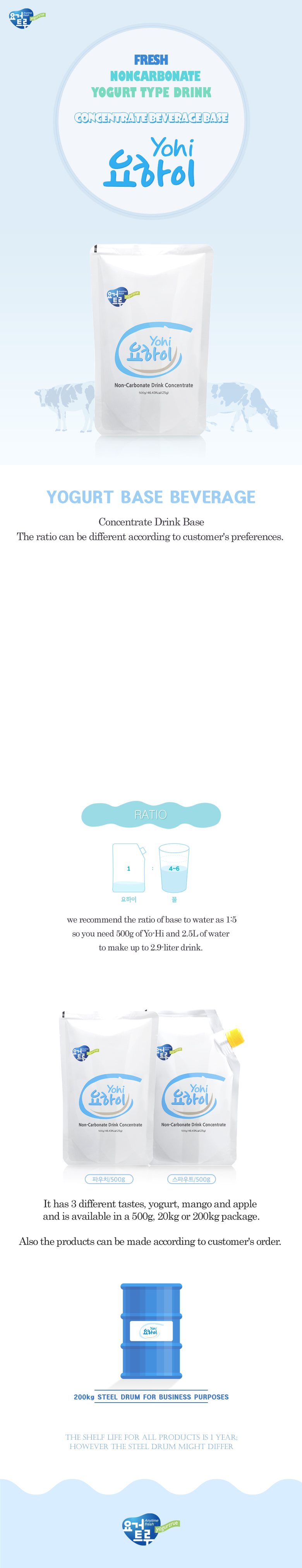 浓缩饮料基础液Yo-Hi,从浓缩饮料可以知道,根据消费者的口味可以用水以一定比例稀释后品尝的产品。每个比例其味道不同,但根据本公司推荐的1:5比例用水稀释时,500g的产品可以制作最多2.9L的饮料,保质期为1年,有酸奶、芒果、苹果等3种味道,产品包装有500g、20kg、200kg。可以根据顾客的订单进行订单生产。