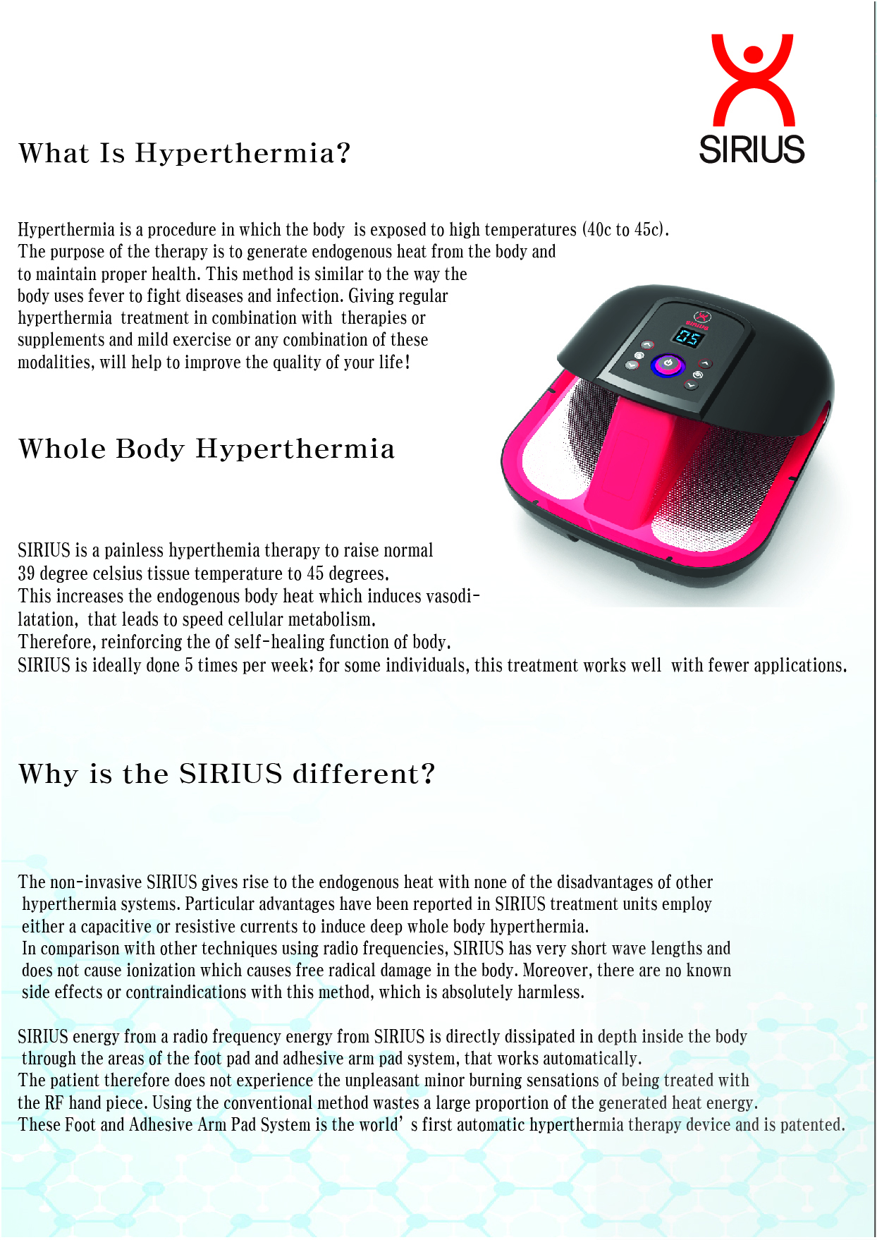 This therapy uses hyperthermia, a medical situation in which the body is exposed to high temperatures, to painlessy stimulate the body into raising its own internal temperature.