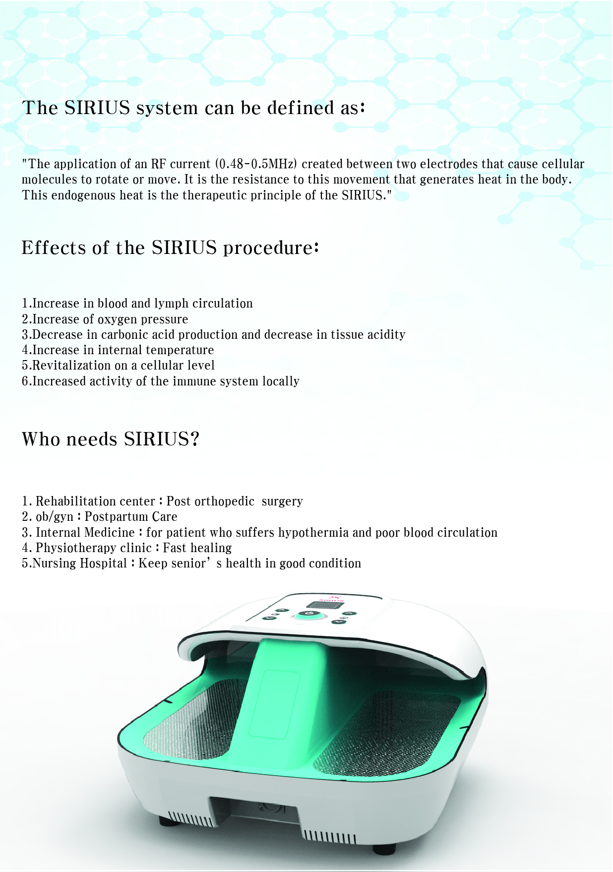 Hyperthermia Therapy is great for those suffering from hypothermia, those who have poor blood circulation, postpartum care and post orthopedic surgery care.