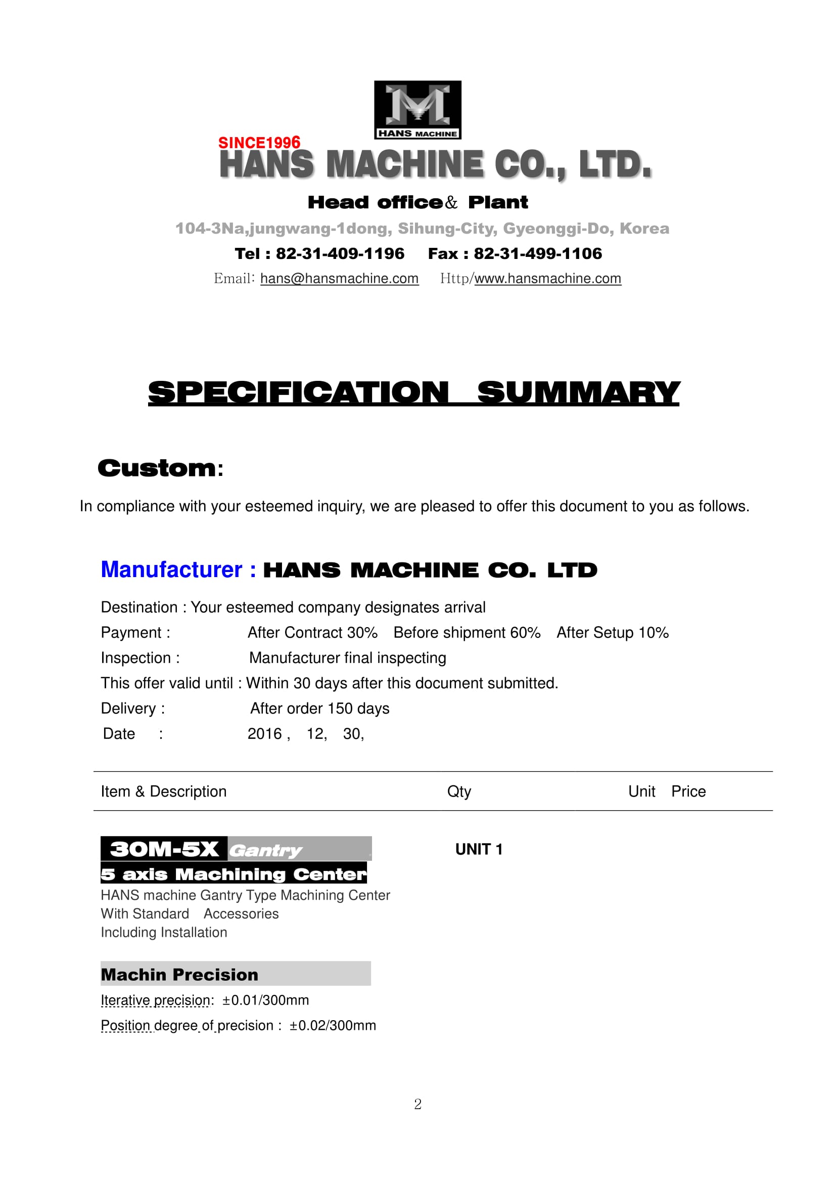 ∙ Feed rate of table : 1~10,000mm/min