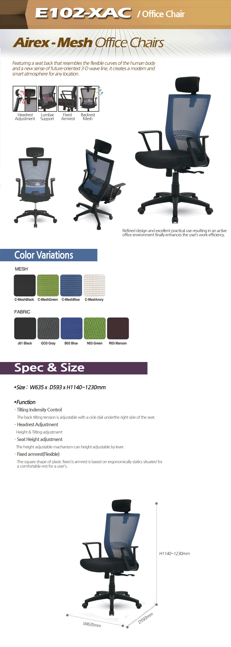 Whole surface of backrest is designed with top-class mesh material. It has a smooth ventilation function and is excellent in elasticity resulting in supporting back and spine softly.