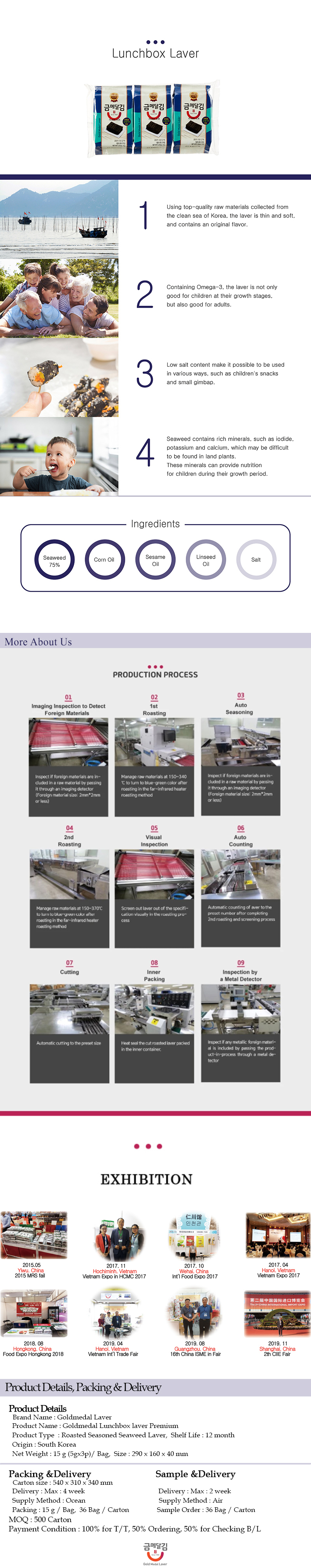 Goldmedal laver is made only with the best quality of seaweed grown in the clean area of the west coast and is thin so you can enjoy its smooth taste.