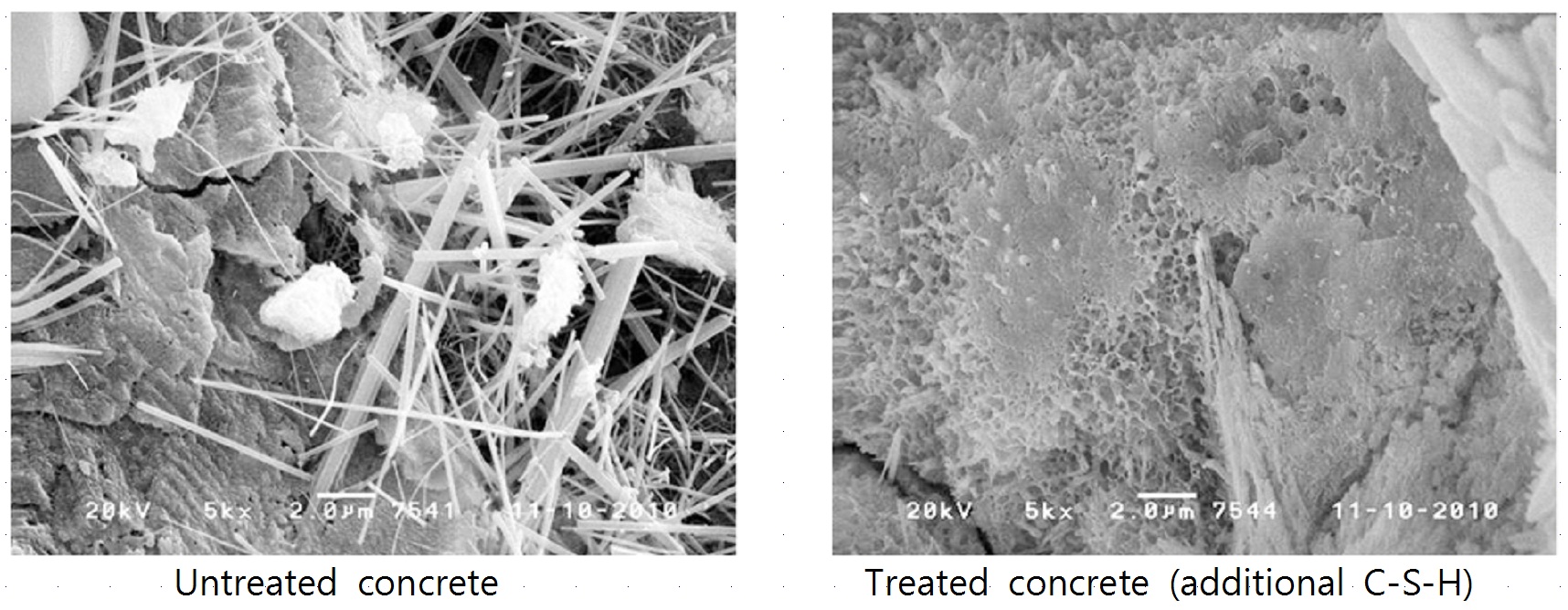 - The main material is soluble silicate. When it is applied on concrete, it penetrates into concrete, reacts with the excess calcium hydroxides of concrete and then forms additional C-S-H(calcium silicate hydrate) which is integrated with concrete.