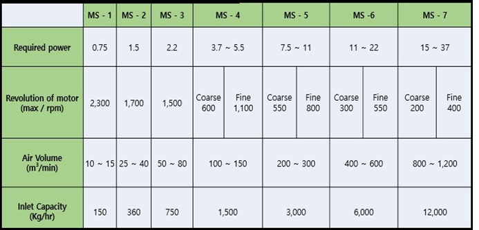 Wonjin Tech’s classifier rotor consists of three steps. The classifier is suitable to distribute fines accurately. Fine material which has strong cohesion or adhesiveness is separated by turning force of rotor and centrifugal force of strong air. Efficiency of classifying is very high (around 80~90%). The classifier saves space for erection due to compact size compared to other separators.