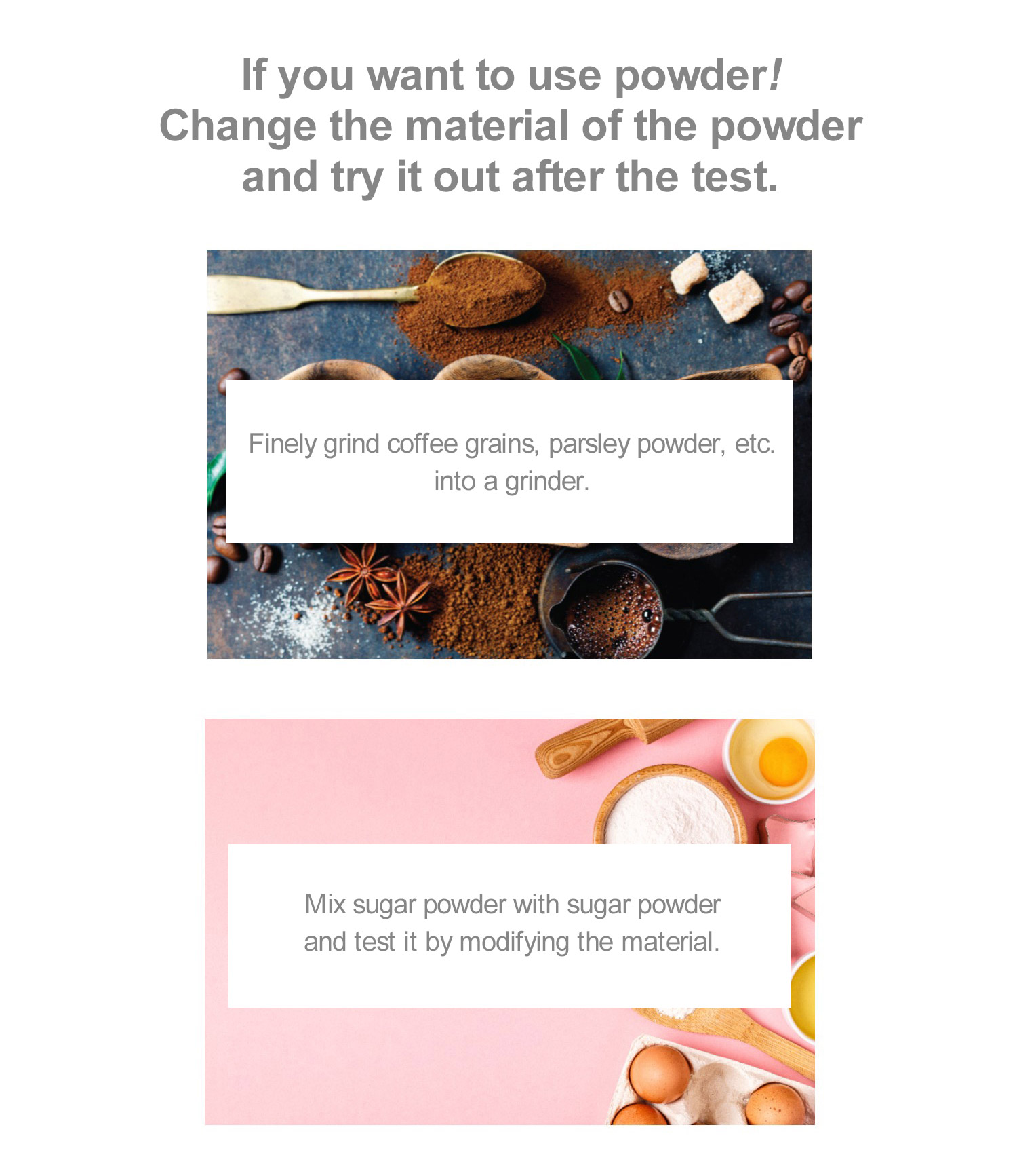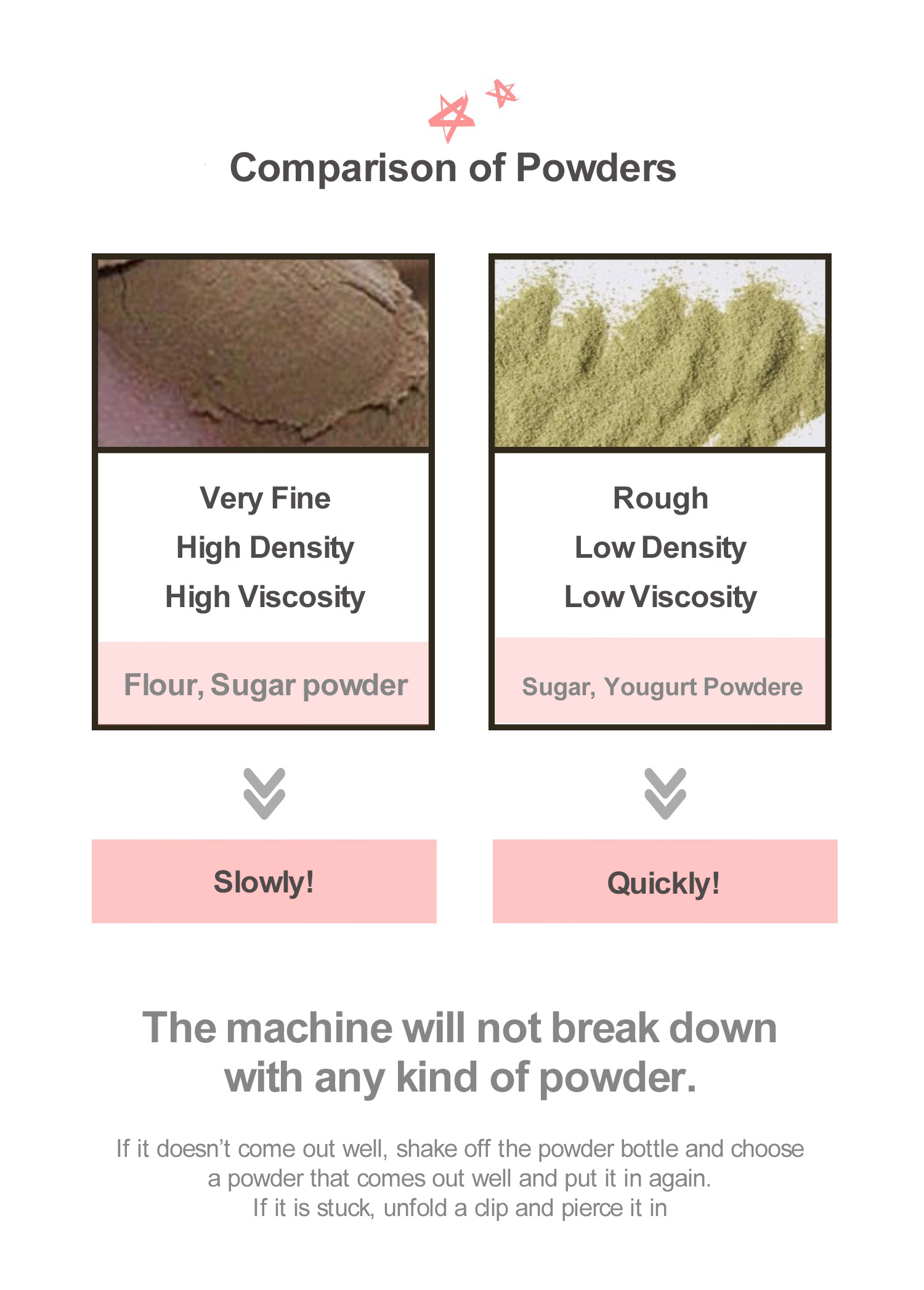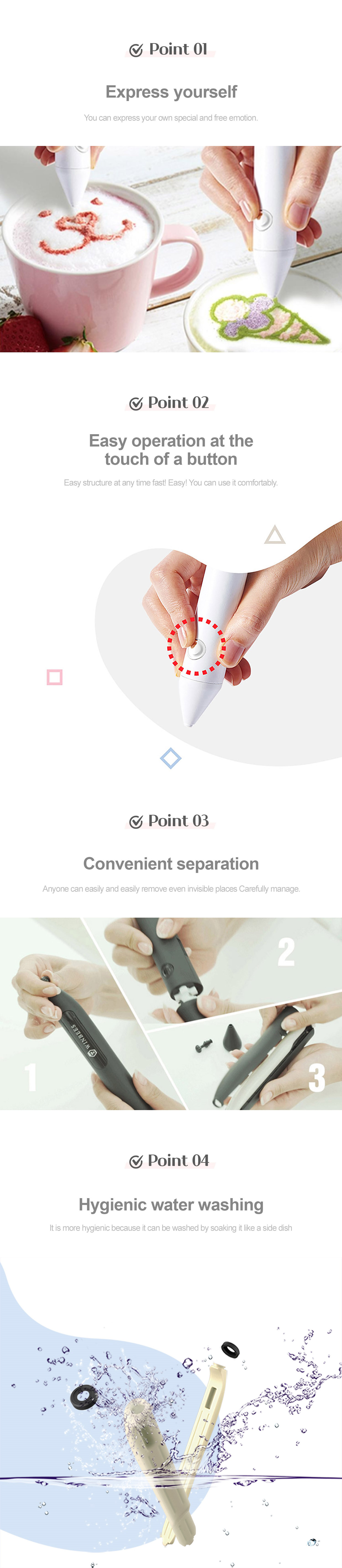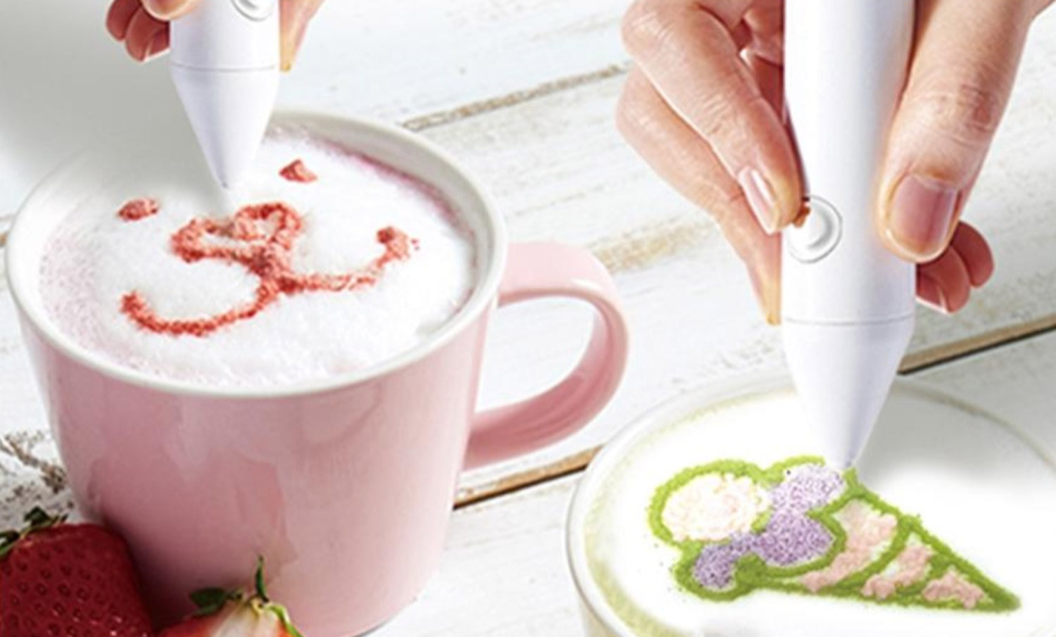 Electronic latte art pens are portable, electric and can easily be used for latte or food decorations such as cake decoration using various small particle materials such as cinnamon, cocoa, green tea, parsley powders etc.