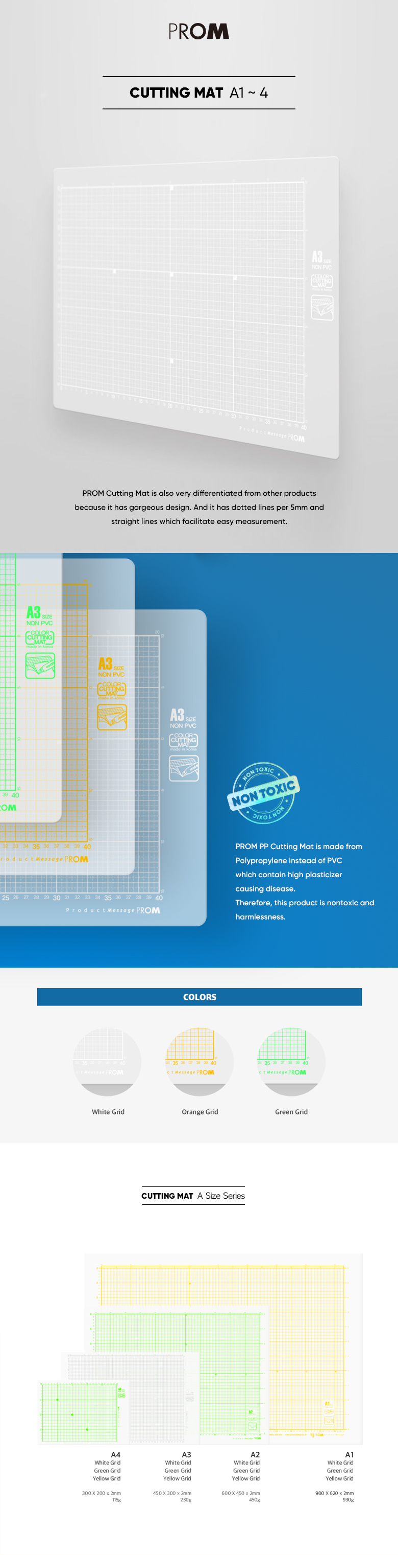 PROM PP Cutting Mat is made from Polypropylene instead of PVC which contain high plasticizer causing disease. Therefore, this product is nontoxic and harmlessness. Our Cutting Mat is also very differentiated from other products because it has gorgeous design. It has 3 colors which are white, green and orange. And it's sizes are A1, A2. A3 and A4. This product can change your work room more pleasant. The function of this product is also good. It has dotted lines per 5mm and straight lines which facilitate easy measurement.