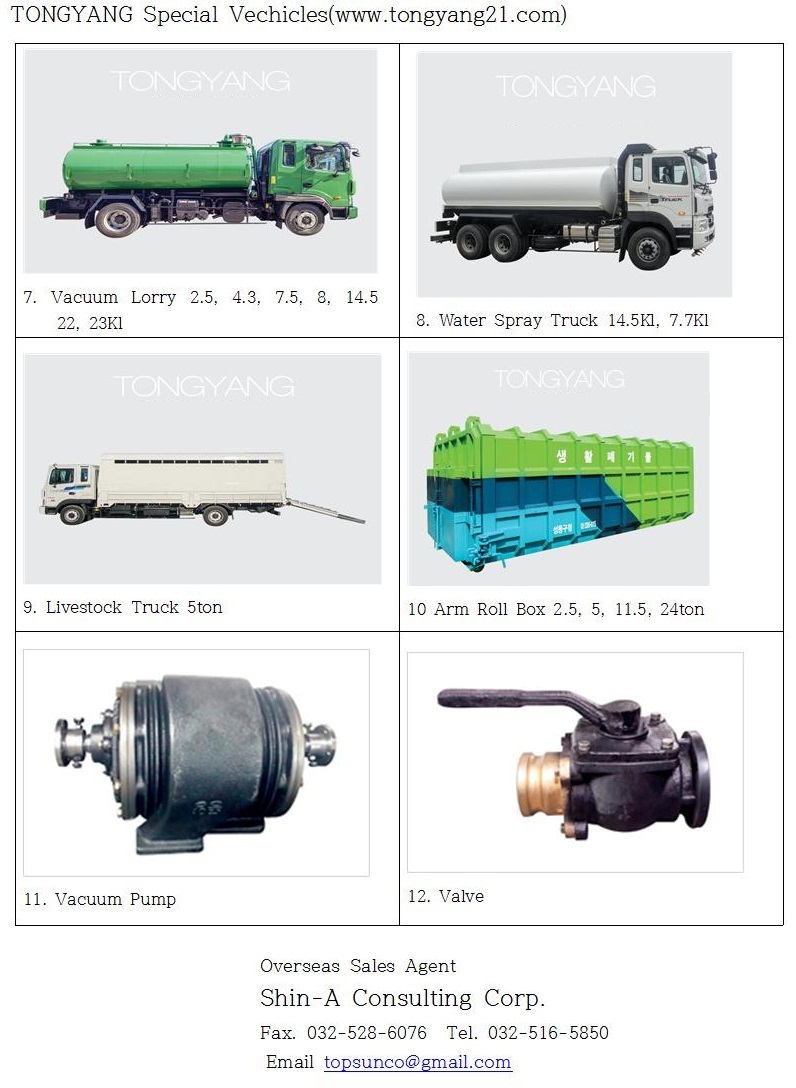 We, Shin-A Consulting Corp., are a sole agent for overseas market of Tongyang Motor’s Company, which is manufacturing Special Vehicles such as Garbage Truck and Arm Roll Truck etc.