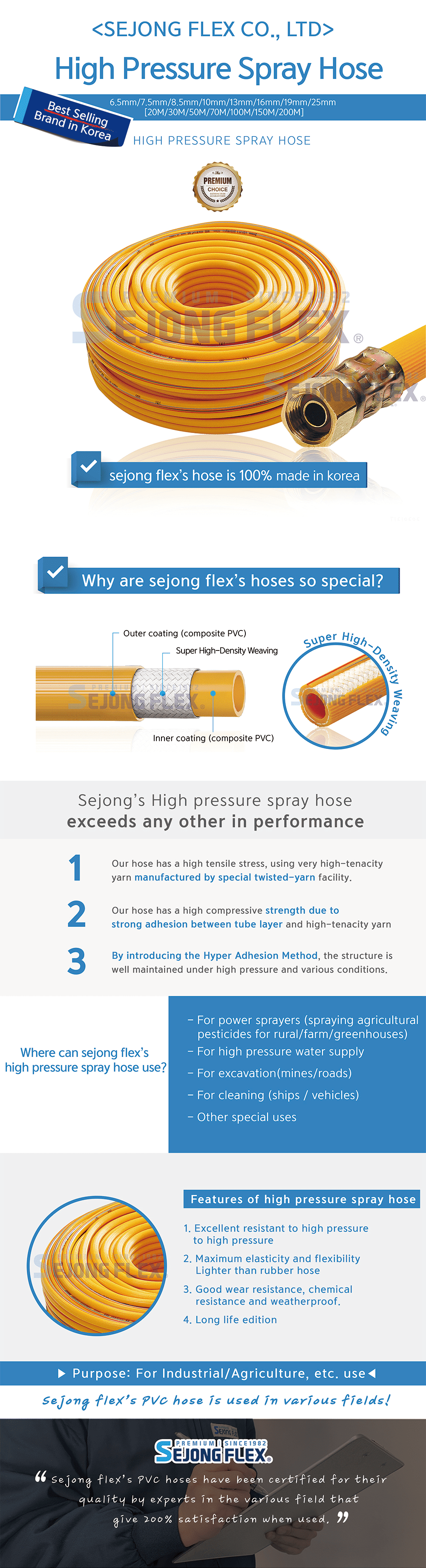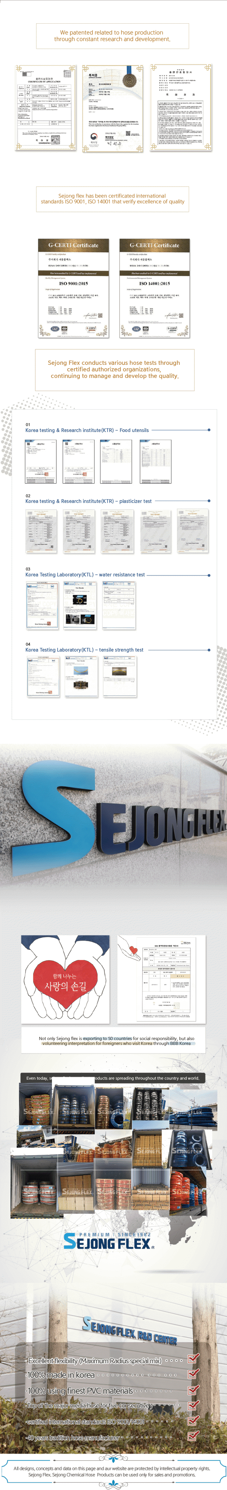 The skilled engineers produce Sejong Flex’s PVC hoses. The quality of all products is 100% guaranteed. Customer satisfaction is the priority. The quality PVC hoses are supplied at reasonable prices at the right time. We assure all company staff that it will become the company developing day by day with your support and will devote to moving forward more and more energetically.
