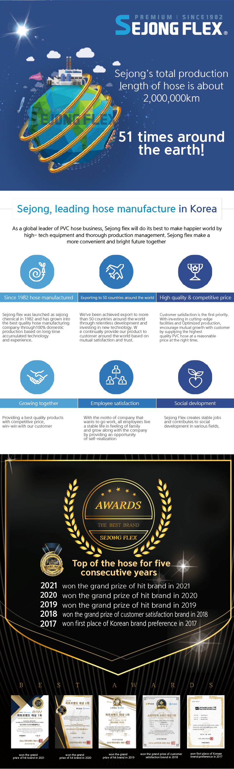 Sejong Flex / Sejong Chemical has grown as the company having the highest competitiveness and specializing in manufacturing PVC hoses based on the technology and experience having been accumulated since it was founded as Sejong Flex in 1982.
