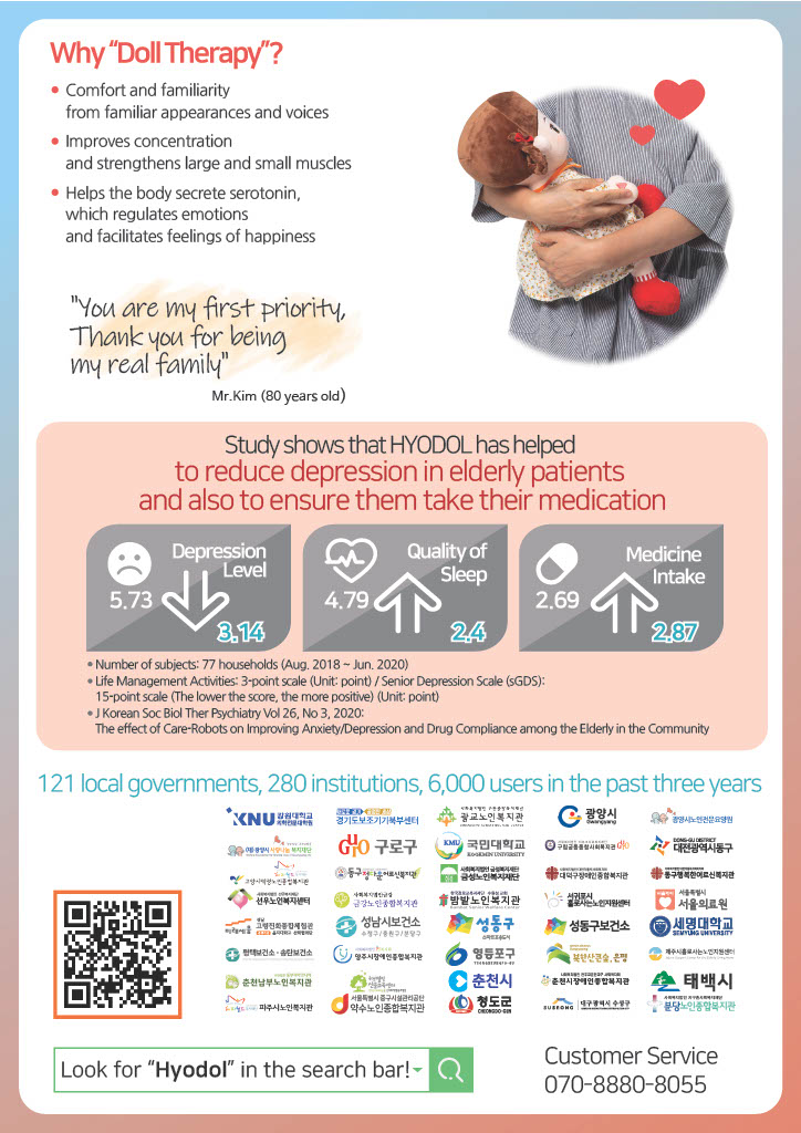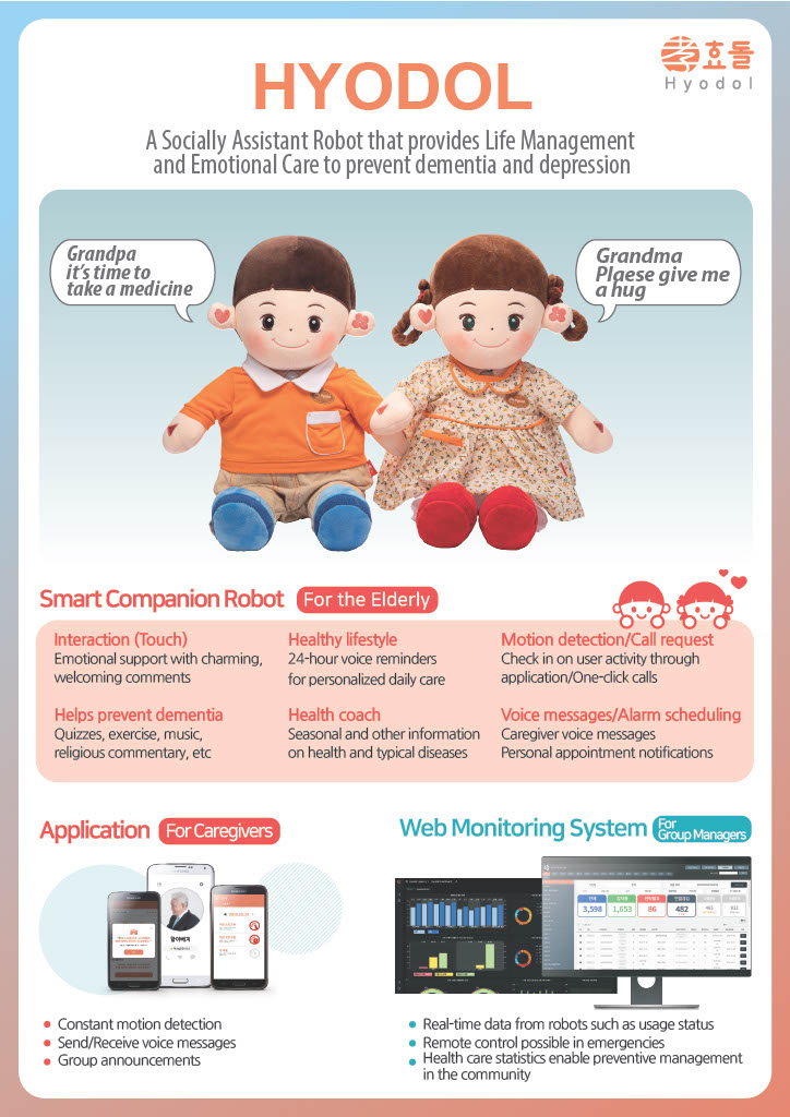 - 'Hyodol' is a socially assistive chat robot for the elderly with a doll-like appearance of a 7-year-old. It aims to improve their emotional well-being and help them live independently.