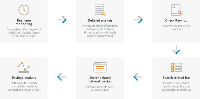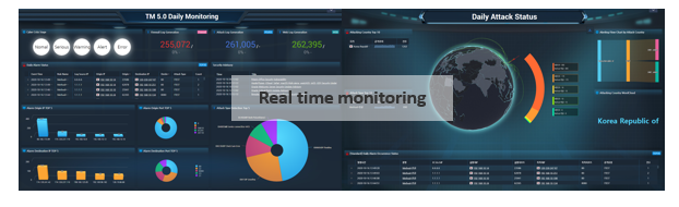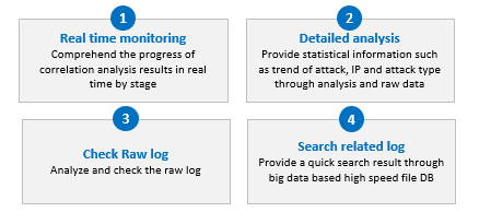 Also, all logs are collected and saved in real-time and analyze in connection with the latest external threat information such as harmful IPs and malicious URLs, various threat elements can be quickly and effectively detected, blocked, and prevented.