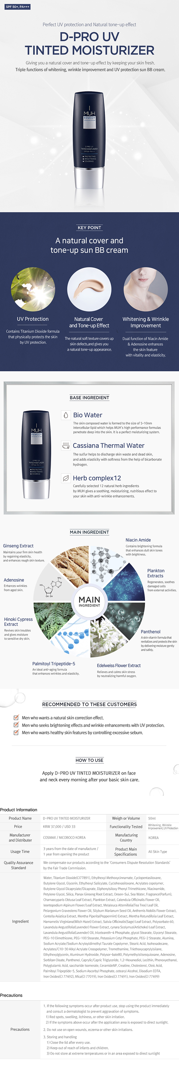 1) White light lotion-type formula, the tinted moisturizer with triple functions of whitening, wrinkle improvement and UV protection (SPA50+, PA+++) maintains non-sticky matte skin with natural cover an tone-up.