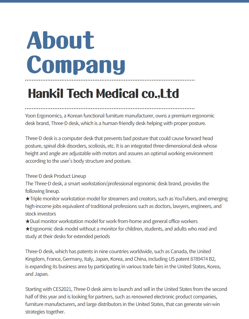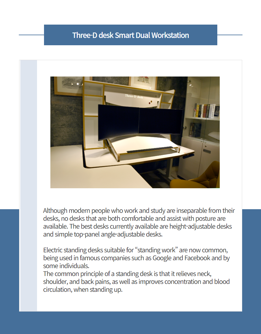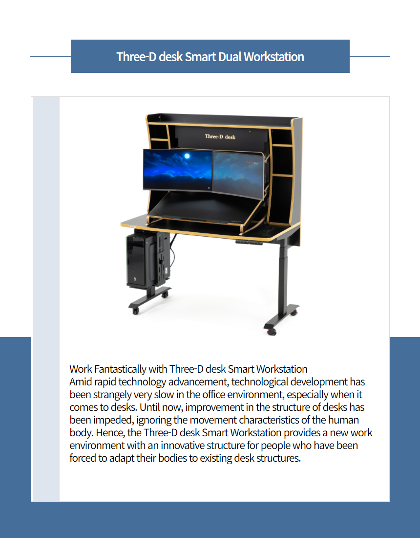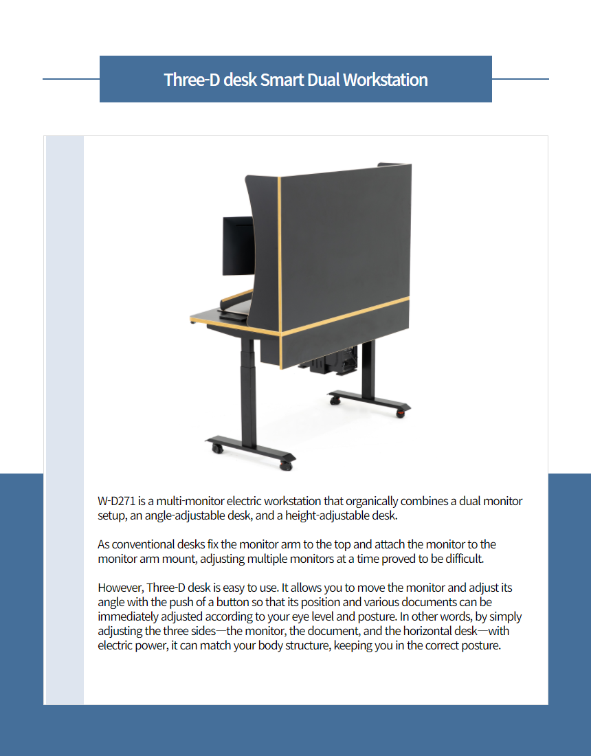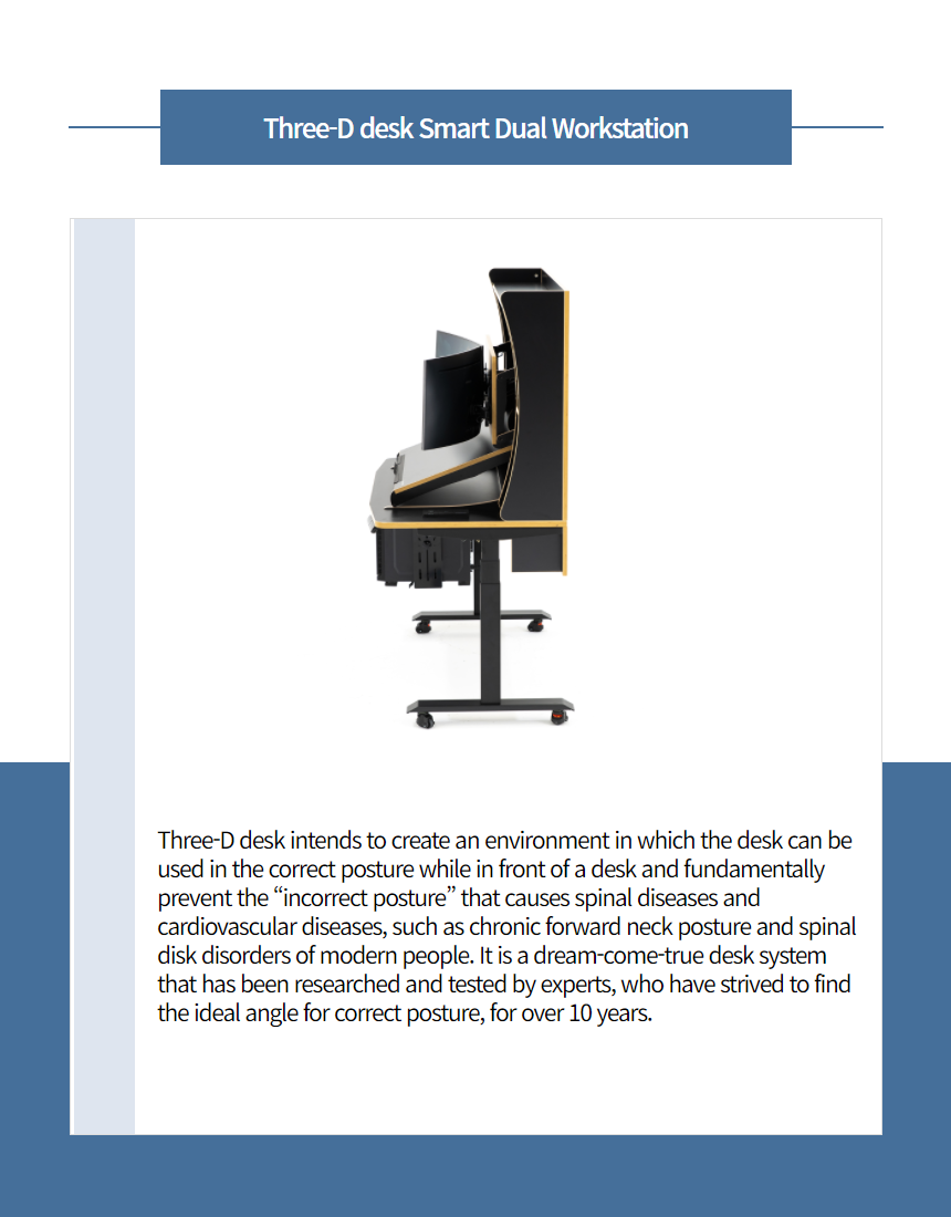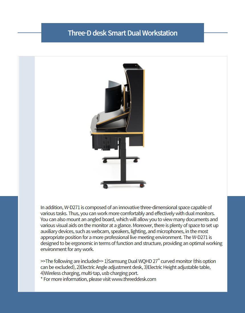 [Three-D desk] is a computer desk system preventing bad posture that could cause forward head posture, disc and scoliosis etc. It is an integrated 3 dimensional desk whose height and angle are adjusted with motors, and assures an optimal working environment according to user’s body structure and posture. >>The following are included>> 1)Dual HD 27" curved monitor (this option can be excluded), 2)Angle adjustment desk, 3)Height adjustable table, 4)Wireless charging, multi-tap, usb charging port.