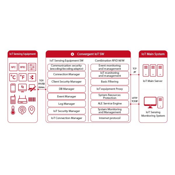 -Convergence type IoT software is developed using Java, which enables the user to operate sensing equipment software and RFID middleware using a unified system.